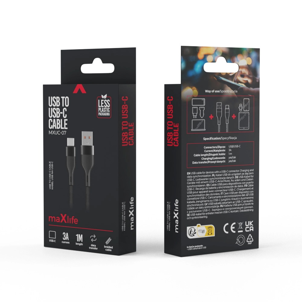 Praktický kabel Maxlife spojuje jednoduchost a odolnost. Nylonové opletení chrání vodiče před zalamováním a opotřebením, zatímco zesílené koncovky zajišťují stabilní spojení při častém zapojování. S proudem až 3 A zvládne rychlé nabíjení kompatibilních telefonů, tabletů a dalších zařízení s USB‑C portem.