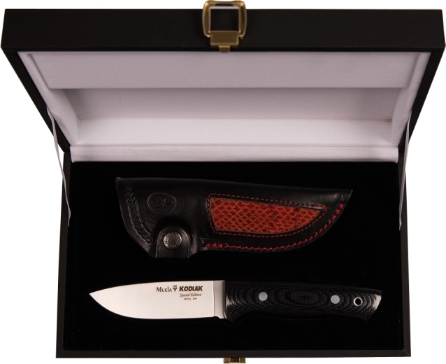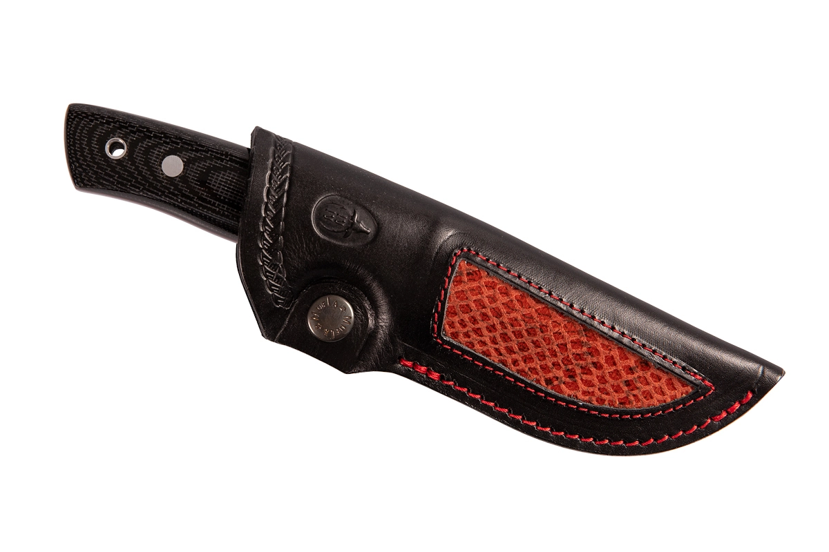 Ergonomická rukojeť z Micarty v černém provedení s elegantní červenou linkou poskytuje jistotu úchopu i za mokra. Očko pro šňůrku usnadňuje jištění nebo zavěšení. Součástí balení je zdobené kožené pouzdro s poutkem na opasek, které zajistí bezpečné nošení a rychlý přístup k noži. Dodáváno v dárkové krabičce – ideální i jako reprezentativní dárek.