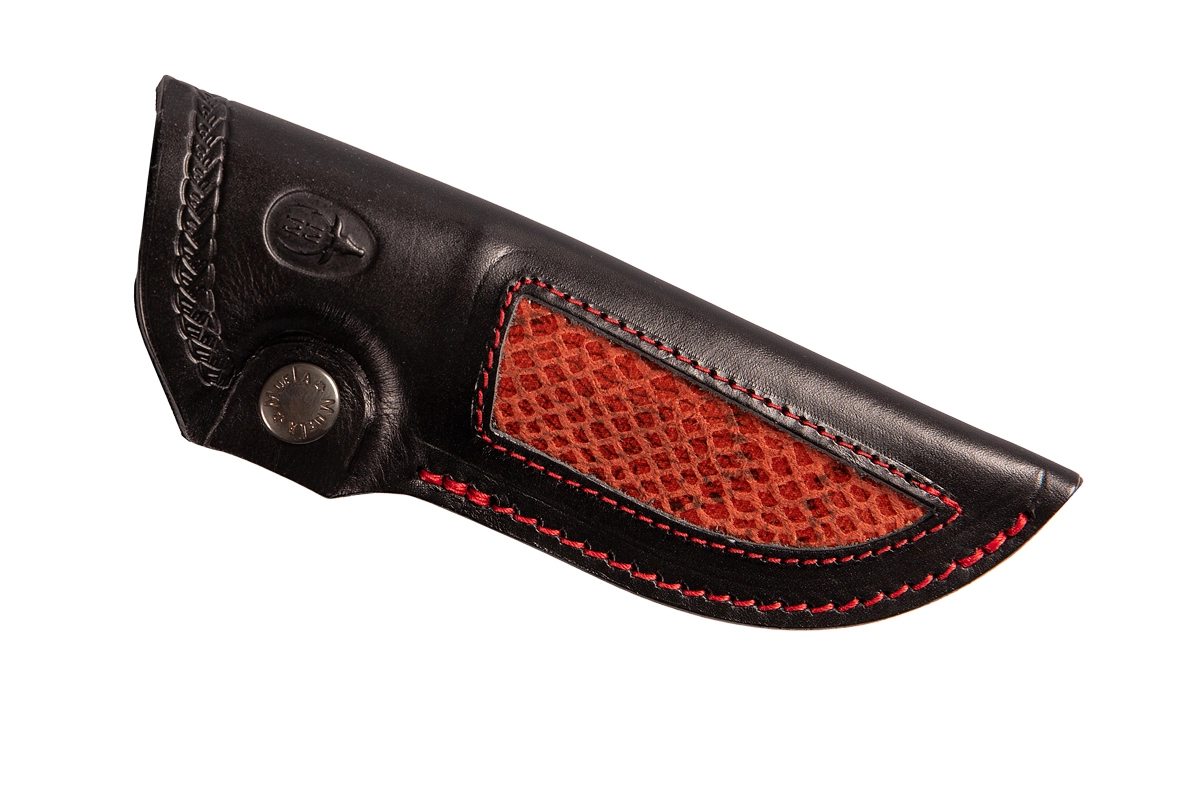 Zdobené kožené pouzdro s pevným patentem a možností upevnění na opasek chrání nůž při přenášení a umožní rychlý přístup.