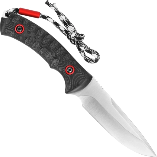Rukojeť z černé micarty s červenými vložkami skvěle padne do ruky, neklouže a poskytuje jistý úchop i v náročných podmínkách. Full‑tang konstrukce zajišťuje vysokou odolnost a dlouhou životnost. Praktická paracord šňůrka usnadňuje vytahování nože a nabízí další možnosti použití v terénu.