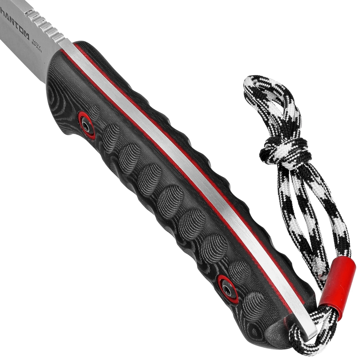 Texturovaná černá micarta s červenými vložkami a zdrsnění na hřbetu pro palec poskytují kontrolu i v mokru. Paracord šňůrka usnadňuje manipulaci.