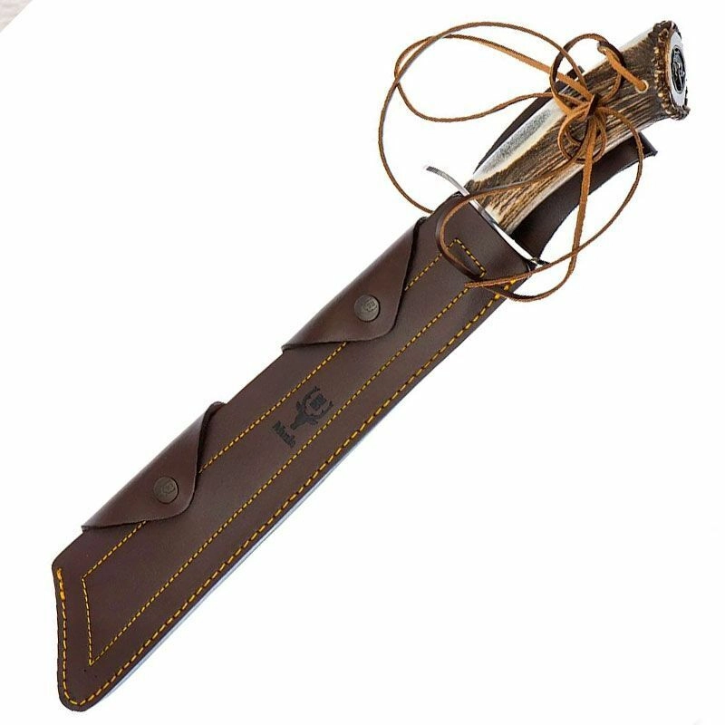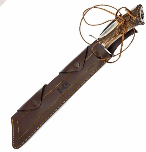 Prémiová rukojeť z přírodního jeleního parohu dodává noži charakter a jistý úchop i v náročných podmínkách. Zakončení ružicí s vloženou kovovou rytinou s loveckým motivem podtrhuje jedinečný vzhled. Dodávané kožené pouzdro umožňuje pohodlné a bezpečné nošení na opasku.