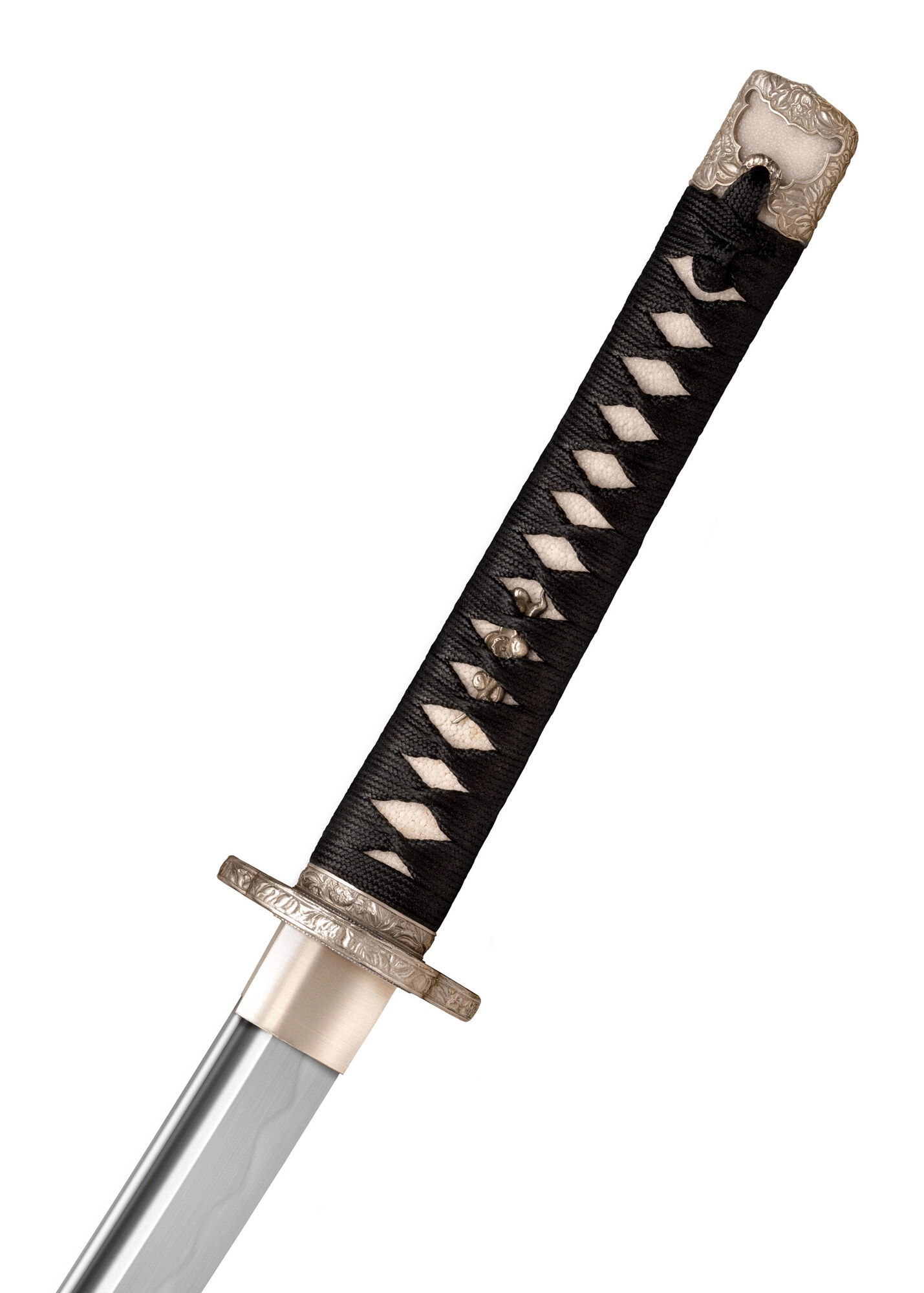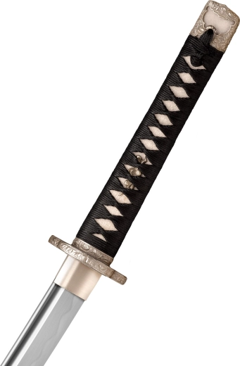 Rukojeť s tradiční omotávkou z černé hedvábné šňůry přes pravou ray skin (same) a menuki poskytuje pohodlí, kontrolu a autentický vzhled.