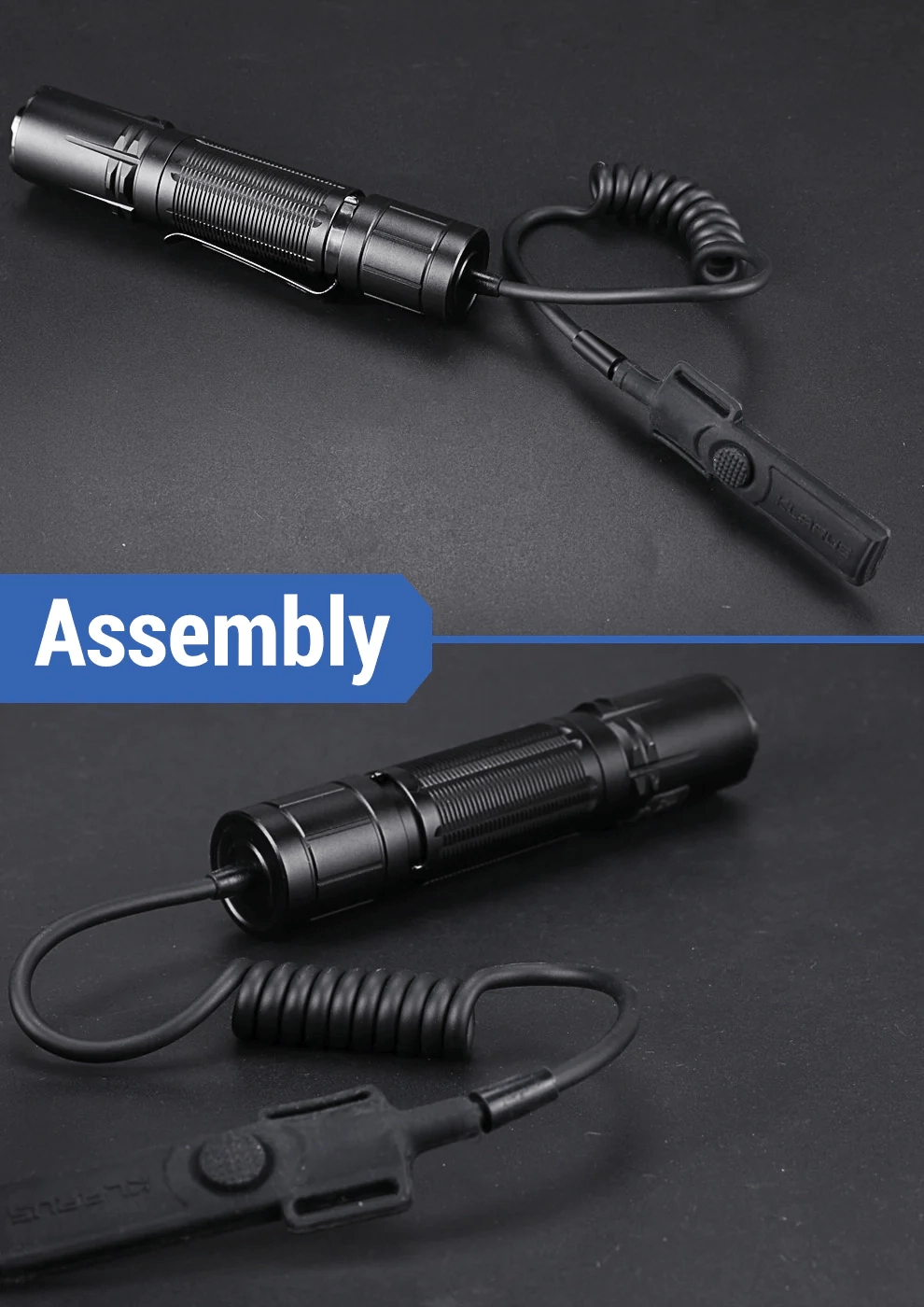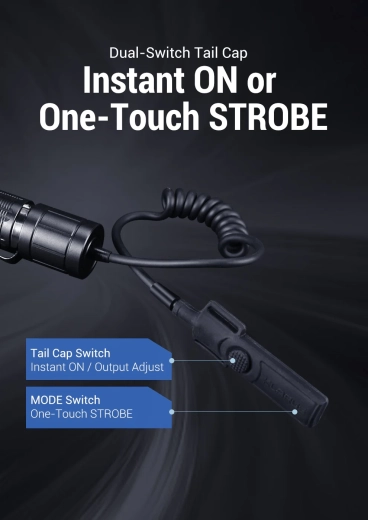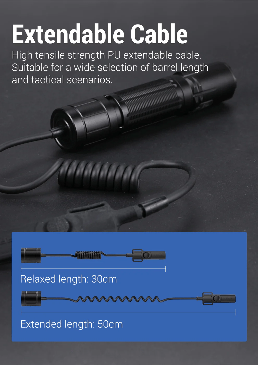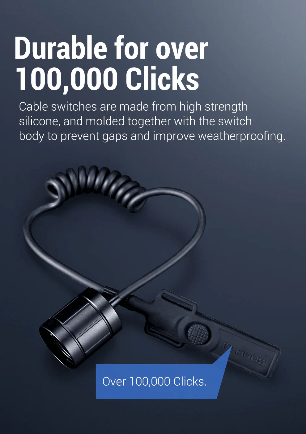 Spínač je navržen s důrazem na odolnost a spolehlivost. Vysocepevnostní PU spirálový kabel se pružně přizpůsobí různým délkám (cca 30–50 cm) a taktickým úchopům. Silikonová tlačítka jsou lisována přímo do těla spínače, čímž se minimalizují mezery a zvyšuje se odolnost vůči povětrnostním vlivům. Životnost až 100 000 kliknutí zaručuje dlouhodobé bezproblémové používání.