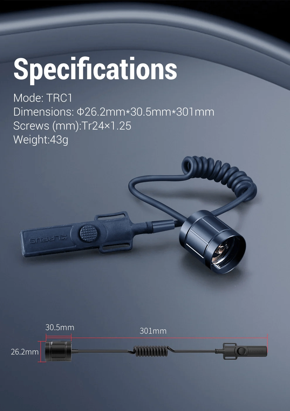 Dálkový kabelový spínač Klarus TRC1 nabízí rychlé a spolehlivé ovládání takticky i v terénu. Má dva samostatné spínače – kulaté tlačítko pro okamžité 100% světlo (momentové i trvalé) a podlouhlé tlačítko pro okamžitý STROBE. Kompatibilní se svítilnami XT11GT PRO V2 a XT2CR PRO, s odolným PU kabelem a životností až 100 000 stisků.
