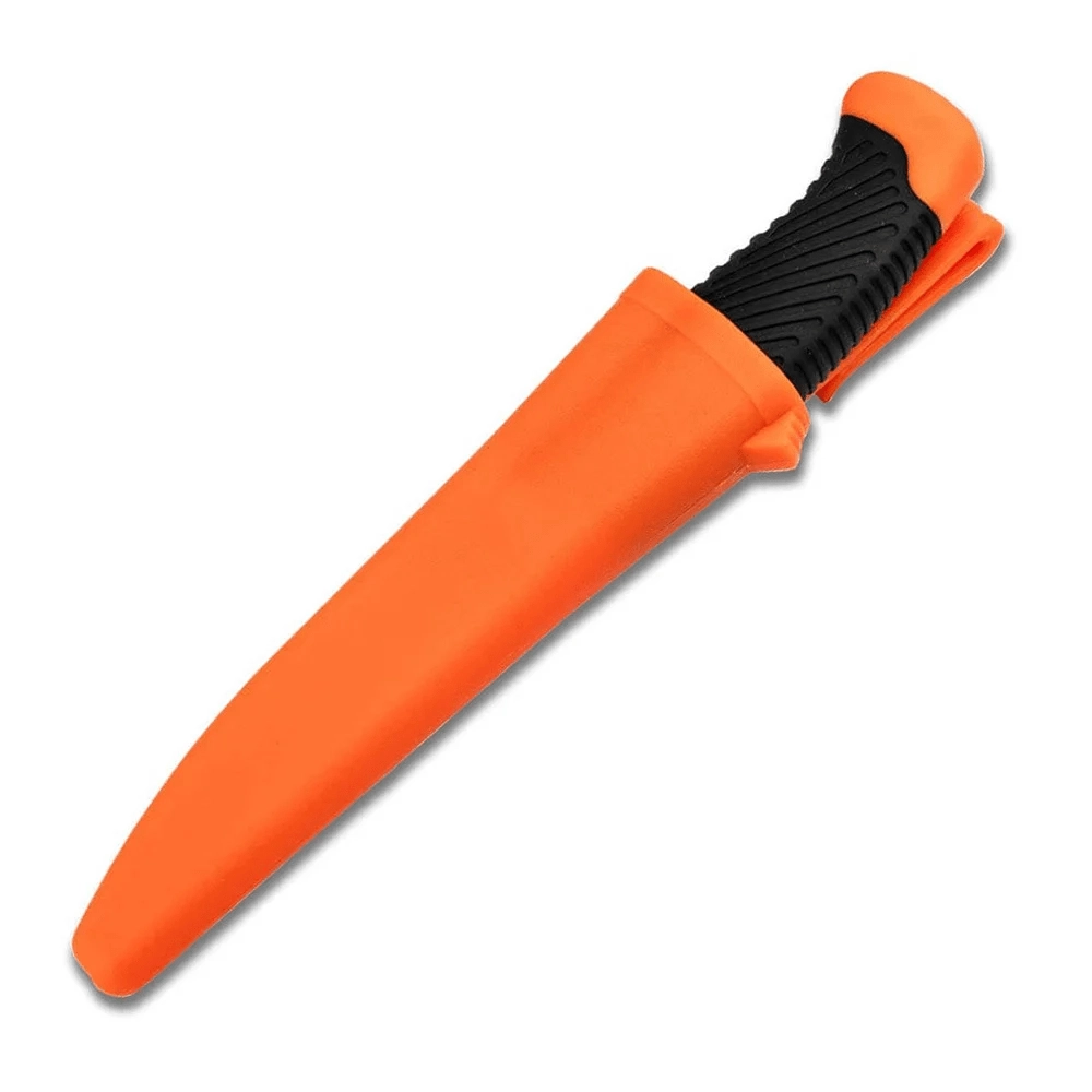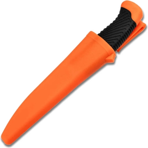 Oranžová rukojeť s texturovaným, protiskluzovým gumovým povrchem zajišťuje jistý a pohodlný úchop i v mokrém prostředí. Odolné plastové pouzdro je chráněné proti propíchnutí či proříznutí, má integrovaný klip pro snadné upevnění na opasek a drenážní otvor pro odvod vlhkosti.