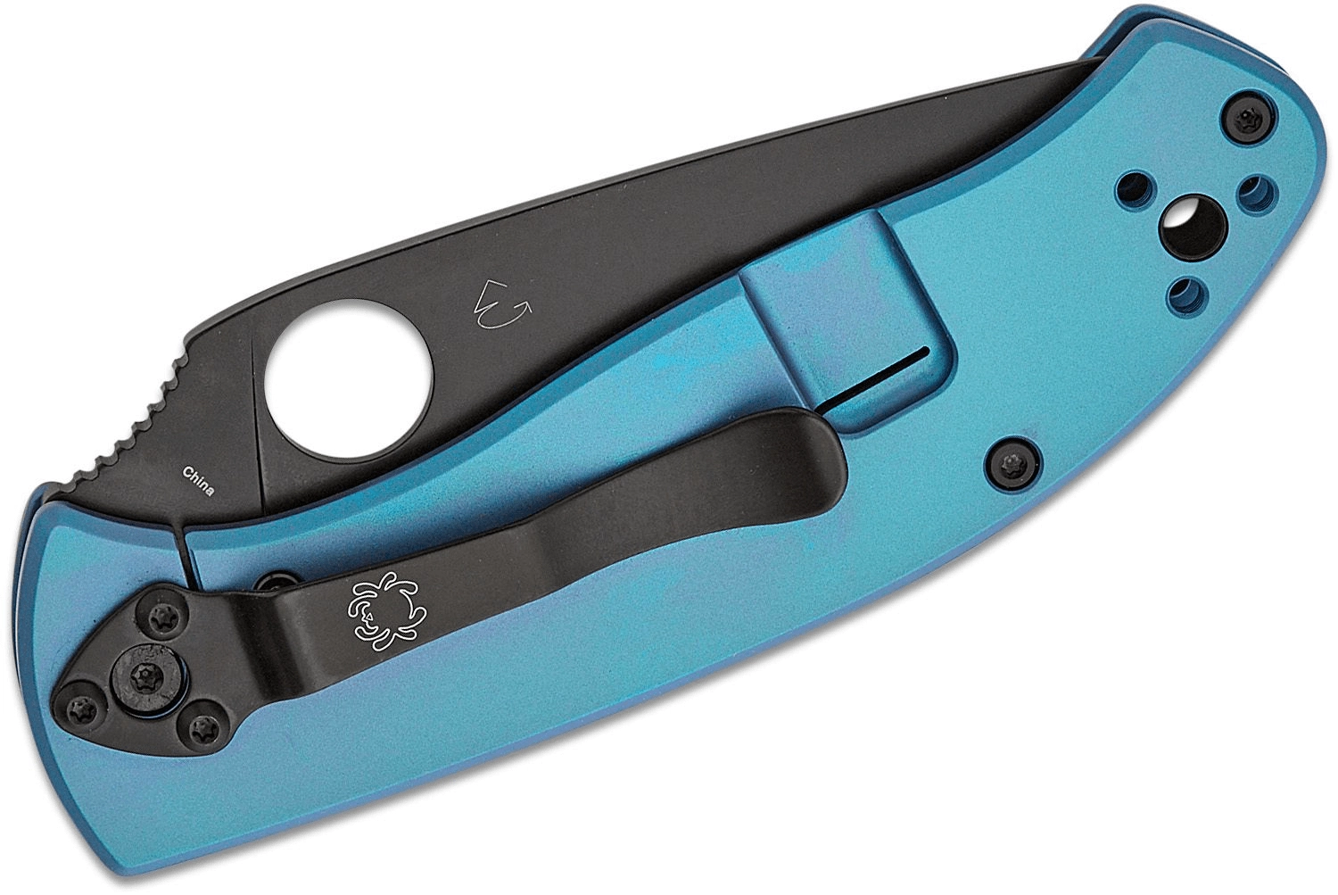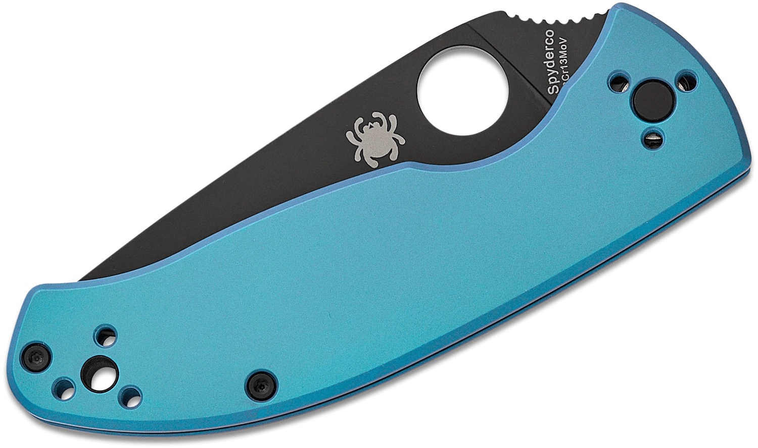 Kompaktní EDC nůž SPYDERCO Tenacious Blue s černěnou čepelí 8,5 cm z oceli 8Cr13MoV a titanovou modrou rukojetí. Nabízí jednoruční otevírání palcovým otvorem, jisté jištění RIL (frame lock) a klip se 4polohovým uchycením pro pohodlné každodenní nošení.