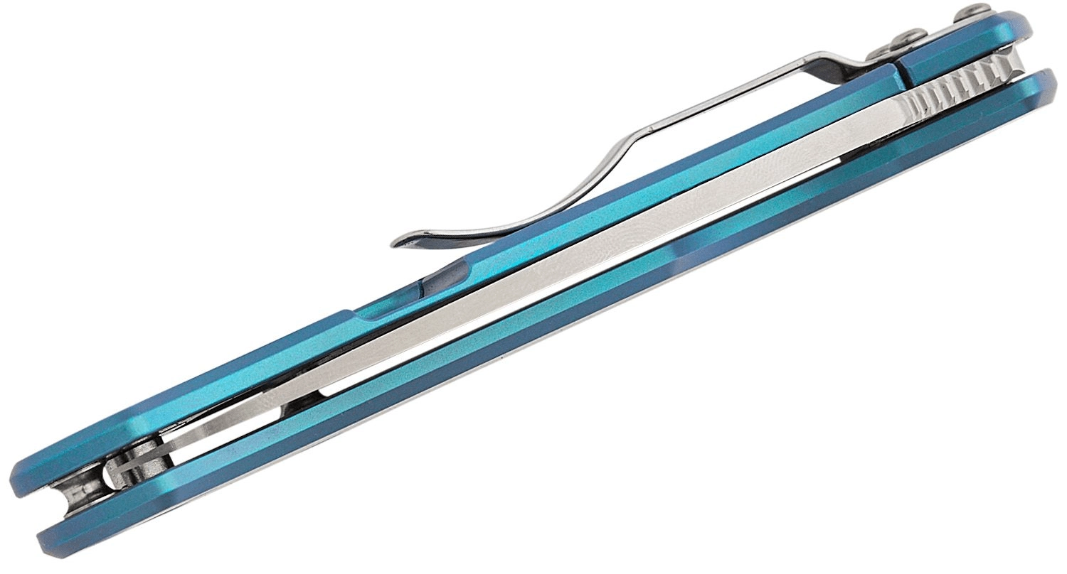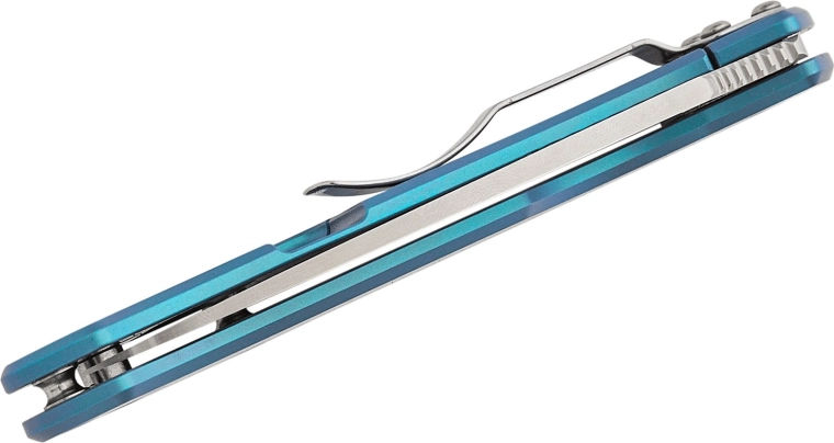 Modrá titanová rukojeť je lehká, odolná a příjemně se drží. Kapesní klip lze nastavit do čtyř poloh (tip-up/tip-down, pravá/levá), takže si nůž přizpůsobíte přesně svému stylu nošení. Praktické očko na šňůru na konci rukojeti usnadní jistění nebo rychlé vytažení z kapsy.