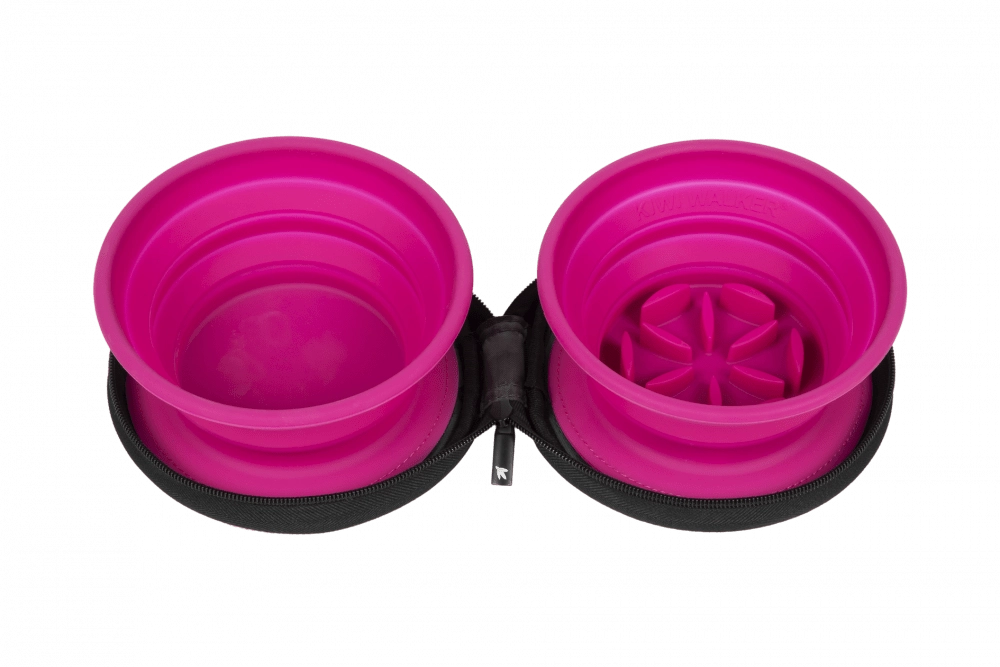 Hledáte lehké a skladné řešení na cesty? Dvojitá cestovní miska KIWI WALKER v růžové barvě kombinuje praktičnost a hygienu. Obě misky jsou vyrobeny z odolného silikonu a pojmou až 350 ml – ideální na vodu i krmivo. Jedna z misek je vybavena protihltací (slow feeder) strukturou, která podporuje pomalejší přijímání potravy.