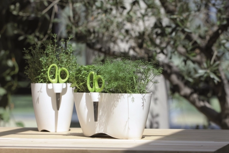 Součástí je praktický držák na nůžky a nůžky s trojitou čepelí pro rychlé a přesné stříhání lístků. Odolný materiál snese venkovní podmínky i sluneční záření, takže je květináč ideální do interiéru i exteriéru.