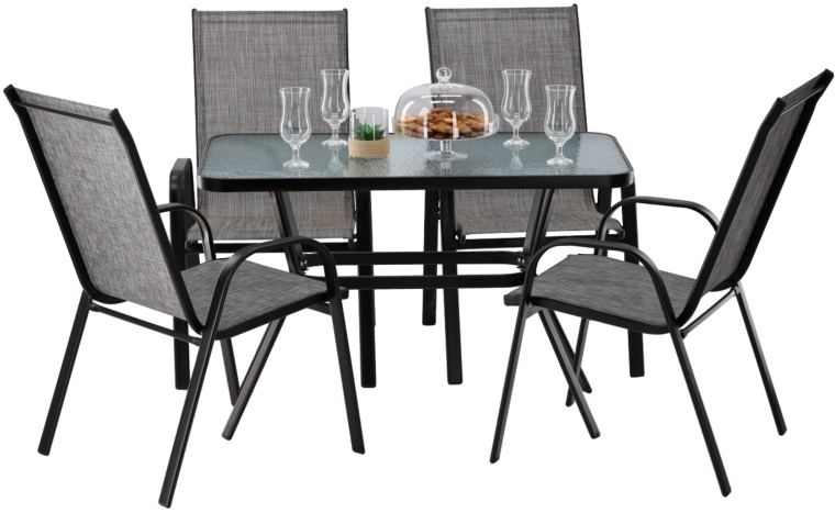 Hledáte praktický a stylový nábytek pro venkovní posezení? Tento zahradní komplet přináší pohodlí, stabilitu a nadčasový vzhled. Židle mají nerozebíratelnou, pevnou konstrukci z oceli s práškovým lakem a prodyšný textilen 2 × 1, který je odolný vůči povětrnosti i snadný na údržbu. Stůl je osazen tvrzeným sklem o tloušťce 5 mm s jemnou transparentní mozaikou pro elegantní vzhled.