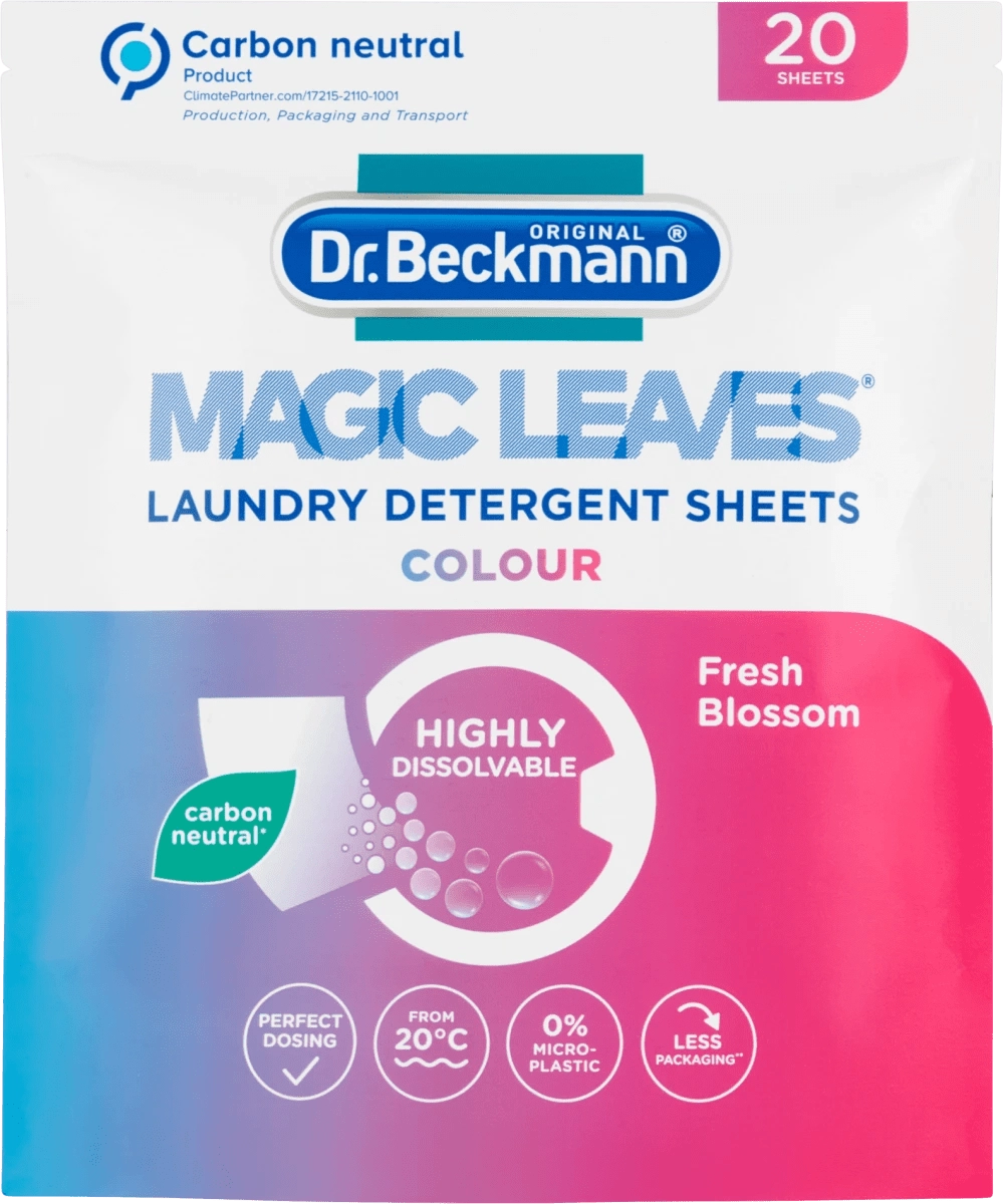 Prací ubrousky Dr. Beckmann Magic Leaves Color udržují zářivé barvy a zajišťují hloubkové čištění už od 20 °C. Jeden ve vodě rozpustný ubrousek pomáhá chránit barvy, zabraňuje přenosu barev a je ideální i pro cestování díky ultralehkému a kompaktnímu balení.