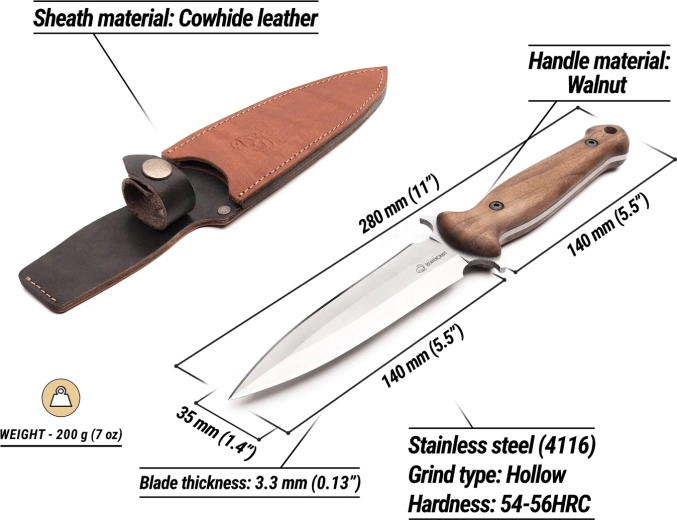 Ergonomická rukojeť z ořechového dřeva skvěle padne do ruky a minimalizuje únavu i při delší práci. Kovové nýty pevně fixují střenka a umožňují snadnou demontáž pro čištění. Praktické kožené pouzdro s poutkem na opasek a jištěním na druk drží nůž bezpečně na místě, ať jste na stezce nebo v dílně.