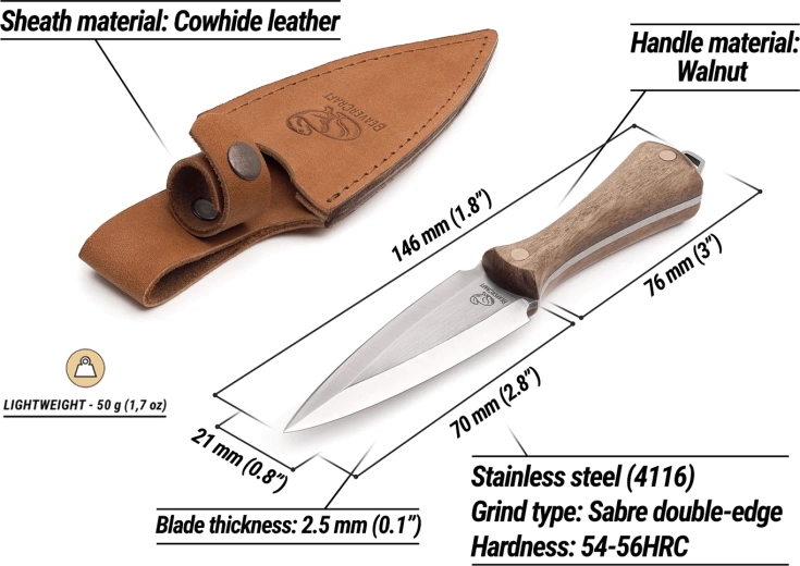 Rukojeť z evropského ořechu s mosaznými nýty perfektně padne do ruky a poskytuje jistý úchop i při delším používání. Praktický otvor pro šňůrku zvyšuje bezpečnost a přenosnost. Součástí balení je kvalitní kožené pouzdro s poutkem na opasek a bezpečným zapínáním, takže nůž budete mít vždy po ruce – a přitom bezpečně uložený.