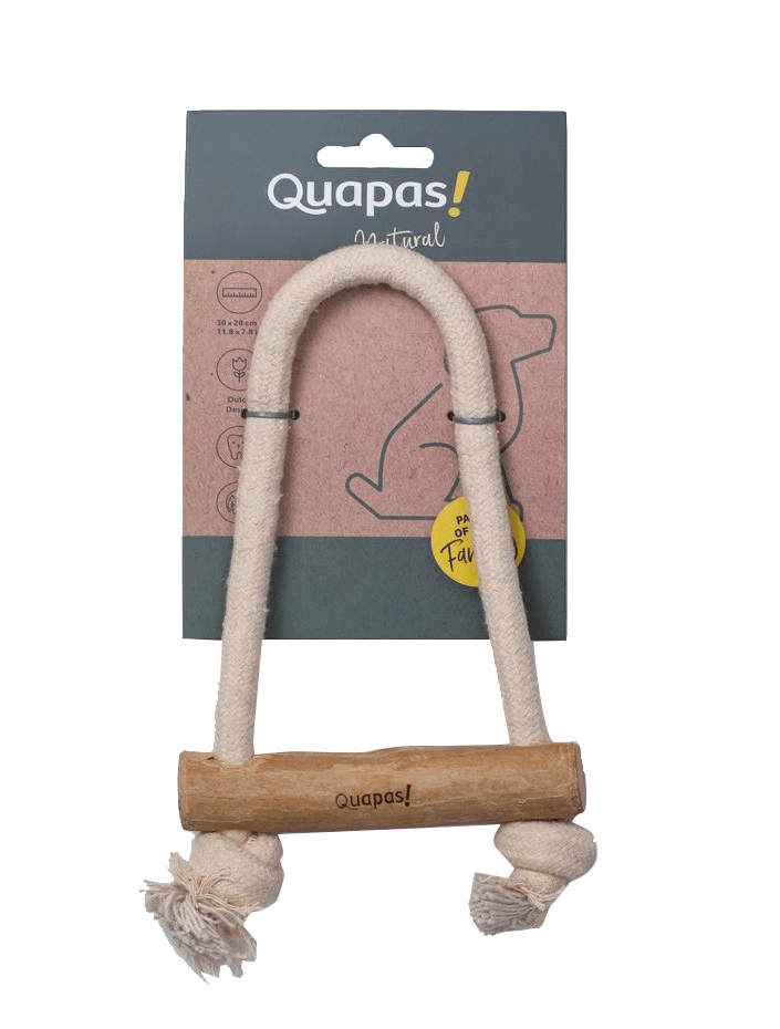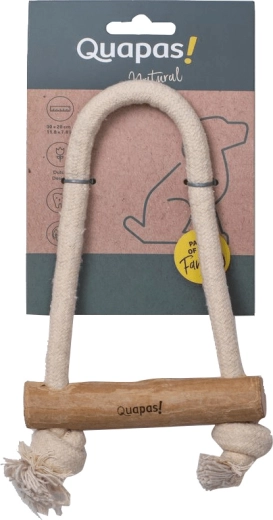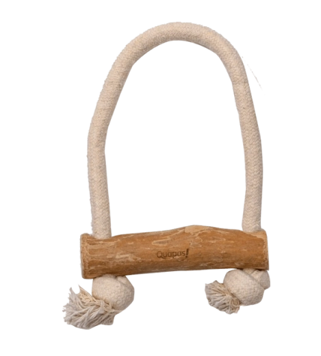 Hračka pro psy Quapas! Pull kombinuje pevné bavlněné lano a přírodní kávovníkové dřevo pro zábavné přetahování a bezpečné žvýkání. Podporuje interaktivní hru, přirozeně čistí zuby a masíruje dásně a díky odolným materiálům vydrží i intenzivnější používání.