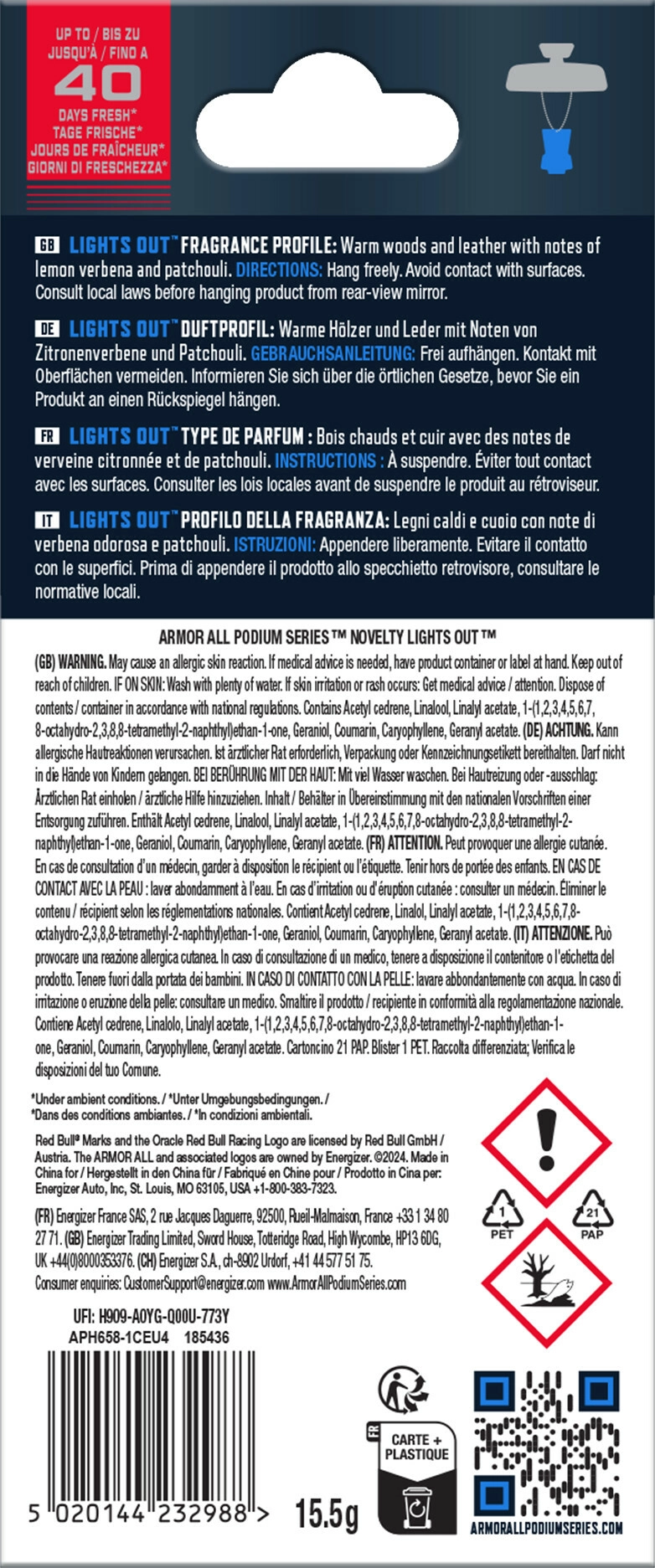Objevte závěsnou vůni do auta ve tvaru Formule 1, která zaujme nejen designem, ale i sofistikovanou vonnou kompozicí. Spojení značek Armor All a ORACLE RED BULL RACING přináší prémiový doplněk do každého vozu.