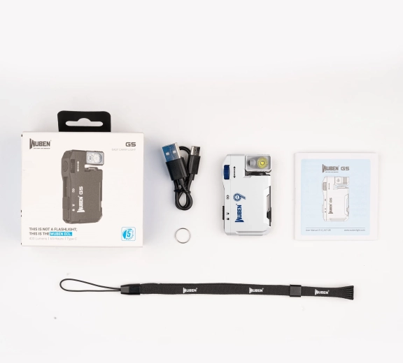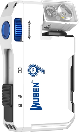 Wuben G5 v bílé barvě kombinuje vysokou odolnost s mimořádnou praktičností. Třísměrná otočná rukojeť a klip umožní připnutí na kšiltovku, popruhy batohu či pracovní oděv, zatímco magnetická základna zajistí stabilní uchycení na kov. Uzamykací mechanismus 2 v 1 funguje jako rychloupínání i kryt nabíjecího portu.