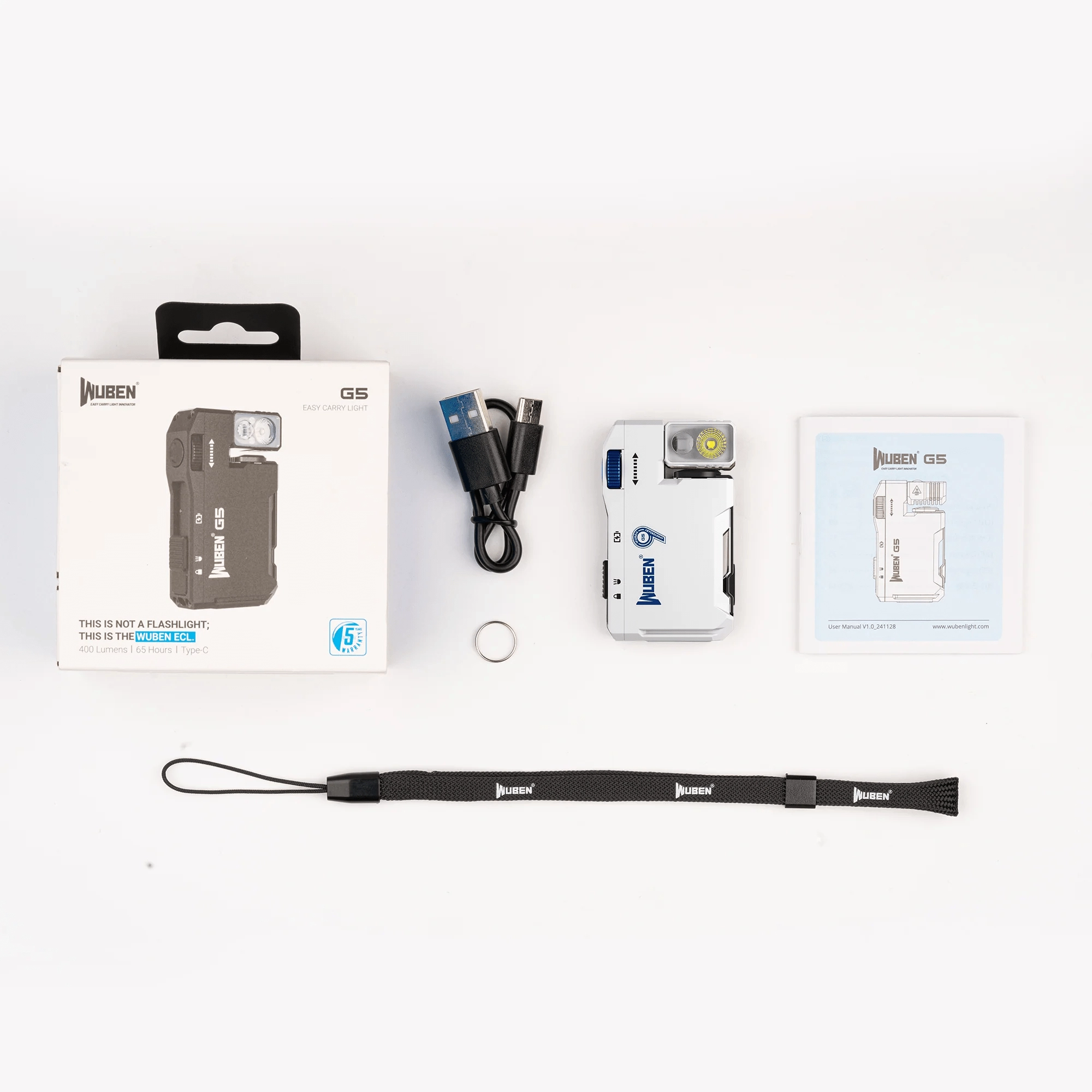 - Svítilna G5, USB‑C kabel, kroužek na klíče, poutko na zápěstí
