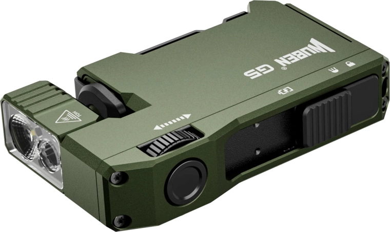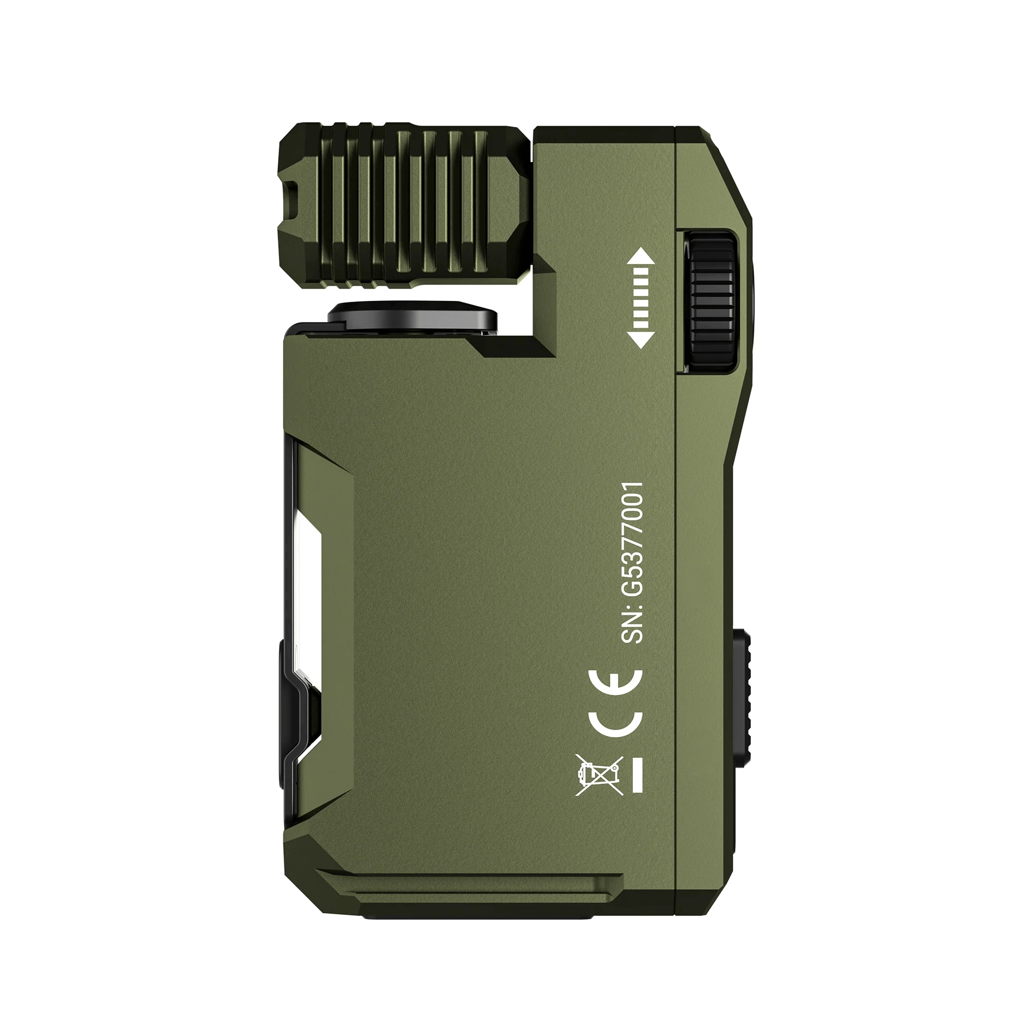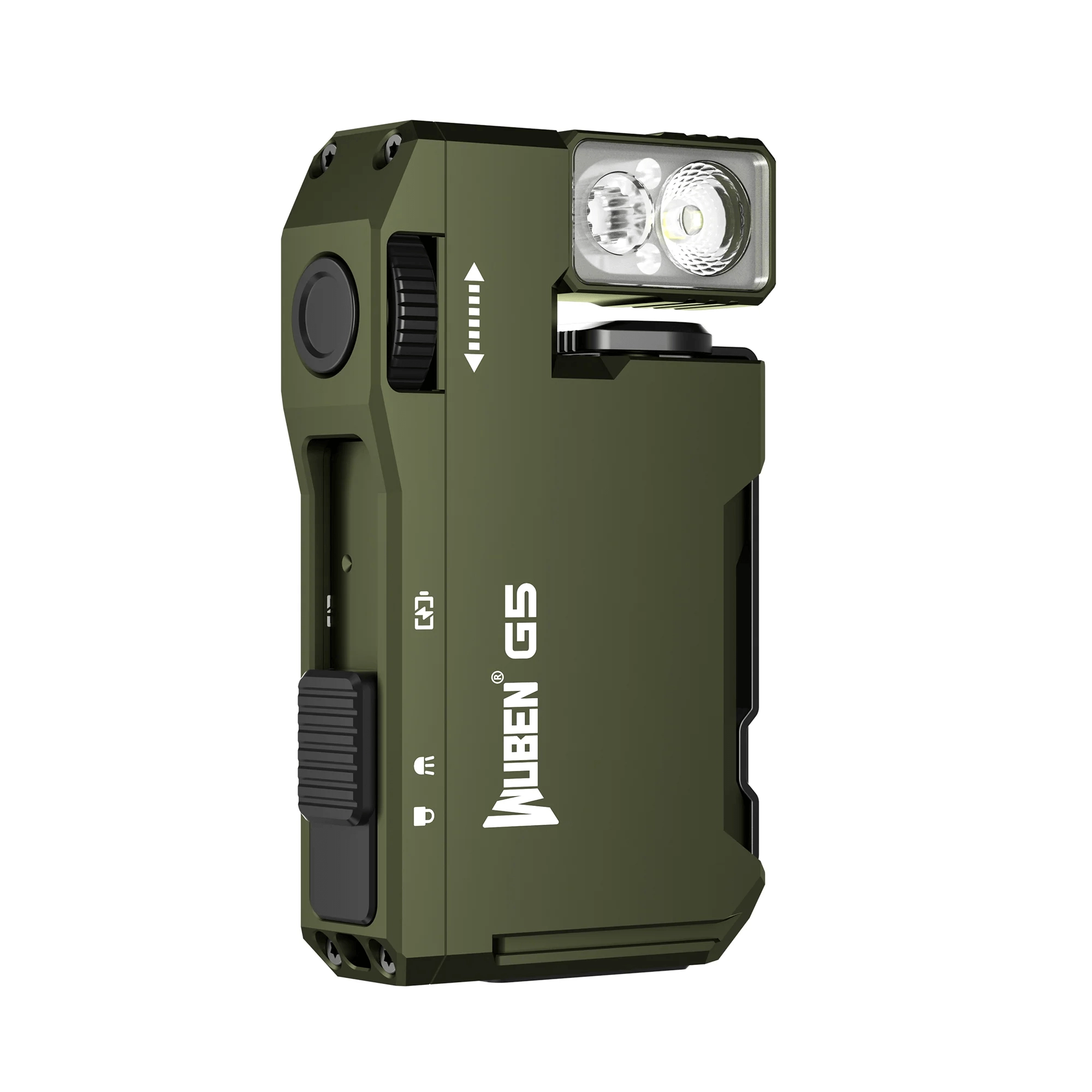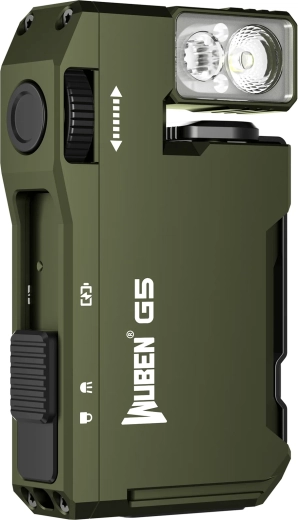 Kompaktní kapesní svítilna Wuben G5 v barvě army zelená nabízí výkon 400 lm, odolnost IP68, otočnou hlavu o 180°, magnetickou základnu a praktický klip pro hands‑free použití. Disponuje plynulým stmíváním 2–400 lm, RGB diodami se 7 barvami a nabíjením přes USB‑C s funkcí passthrough pro současný provoz i nabíjení.