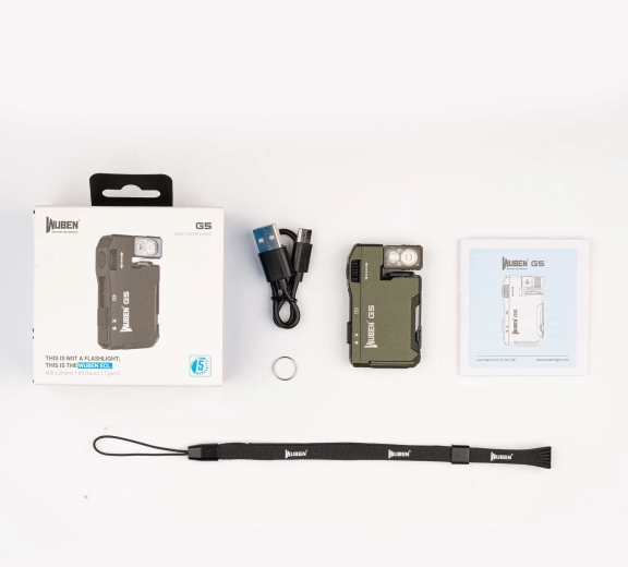 - Svítilna G5, USB‑C kabel, kroužek na klíče, zápěstní poutko