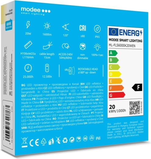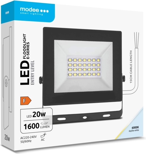 Kompaktní a výkonný LED reflektor MODEE E‑series Slim nabízí 20 W příkonu, světelný tok 1600 lm, široký úhel 120° a studené denní světlo 6000 K. Díky krytí IP65 odolá prachu i silnému proudu vody a je ideální pro osvětlení vjezdů, zahrad, teras či dvorů. Pro snadnou montáž je vybaven 15cm přívodním kabelem a pracuje na AC 220–240 V.