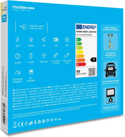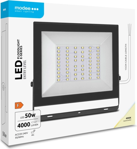 MODEE E‑series Slim je tenký a účinný LED reflektor pro univerzální venkovní osvětlení. Nabízí 4000 lumenů jasu při příkonu 50 W a účinnosti 80 lm/W, takže šetří energii a zároveň poskytuje dostatek světla pro každodenní použití.