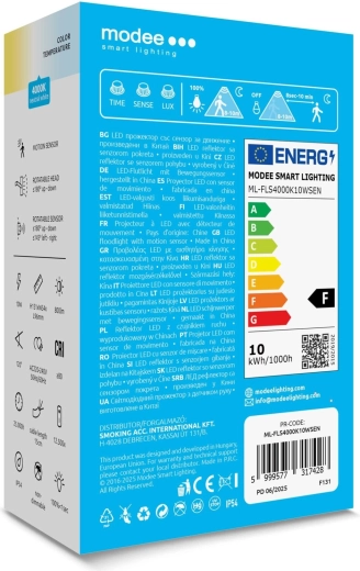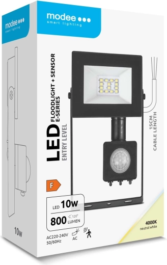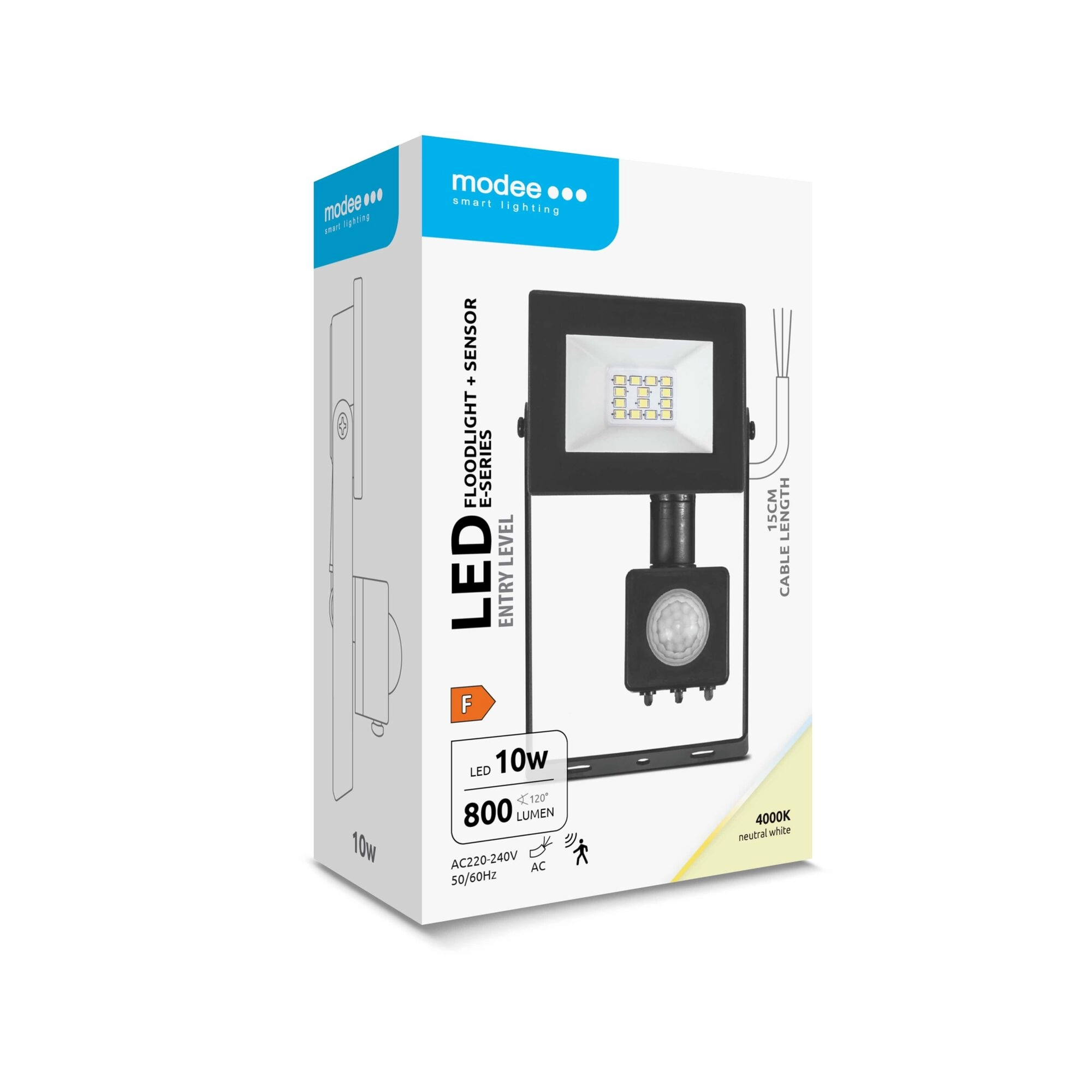 Venkovní LED reflektor MODEE E‑series se senzorem kombinuje úsporný provoz s vysokou spolehlivostí. Poskytuje rovnoměrné osvětlení díky úhlu vyzařování 120° a příjemnou neutrální bílou (4000 K) pro přirozené podání barev. Krytí IP54 zajišťuje odolnost proti prachu a stříkající vodě, takže je perfektní pro exteriéry okolo domu.