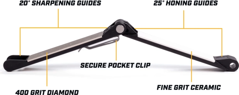 Hrubší diamantová deska 400 grit rychle obnoví ostří, zatímco jemná keramika jej vyhladí a dohoní pro čistý a přesný řez – vše v jednom kapesním nástroji.