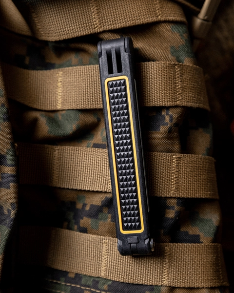 Kompaktní A‑rám se složí do kapesní velikosti a kovový klip umožní bezpečné připnutí k batohu, MOLLE vazbě nebo kapse – vždy po ruce.