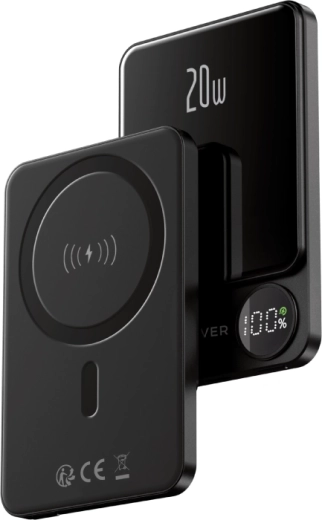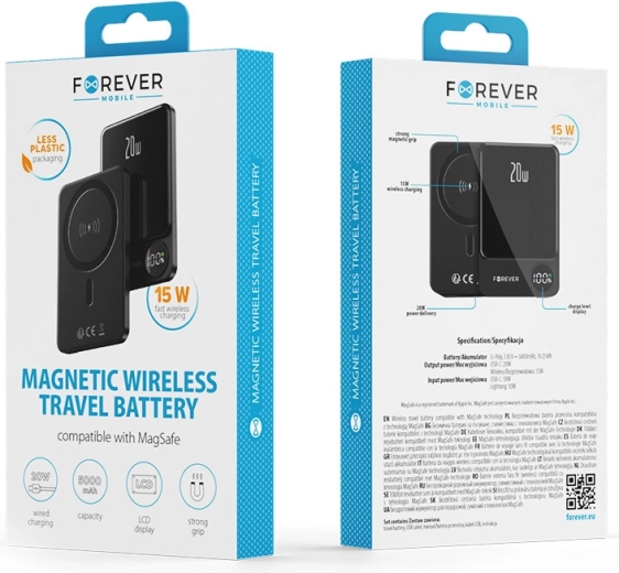 Kompaktní magnetická powerbanka FOREVER s kapacitou 5000 mAh nabízí bezdrátové nabíjení MagSafe pro iPhone 12 a novější, dále univerzální Qi kompatibilitu, a přes USB‑C až 20W PD pro rychlé kabelové nabíjení. Silné magnety drží telefon pevně, LCD displej ukazuje stav baterie a možnost současného nabíjení dvou zařízení z ní dělá ideálního parťáka na cesty.