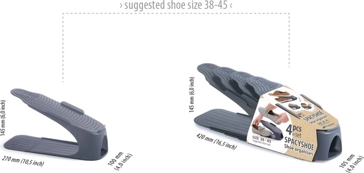 Udržte si pořádek v botníku se sadou organizérů na boty Spacyshoe. Díky dvojitému ukládání obuvi ušetříte až 50 % místa na policích, transparentní provedení zajistí přehledný výběr a protiskluzová úprava se postará o stabilitu. Odolný plast se navíc snadno čistí a je vhodný pro velikosti 38–45 a obuv do výšky až 12 cm.