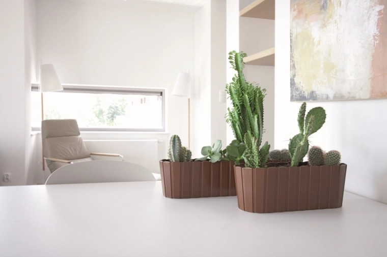 Dekor žaluziových/prkenných lamel dodá truhlíku rustikální charakter, který skvěle ladí s rostlinami i moderním nábytkem.