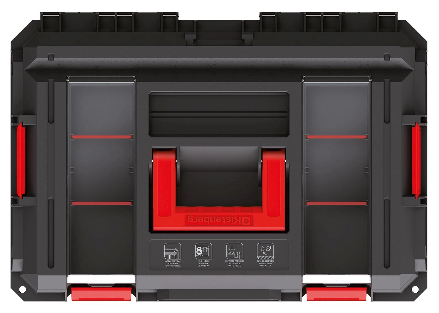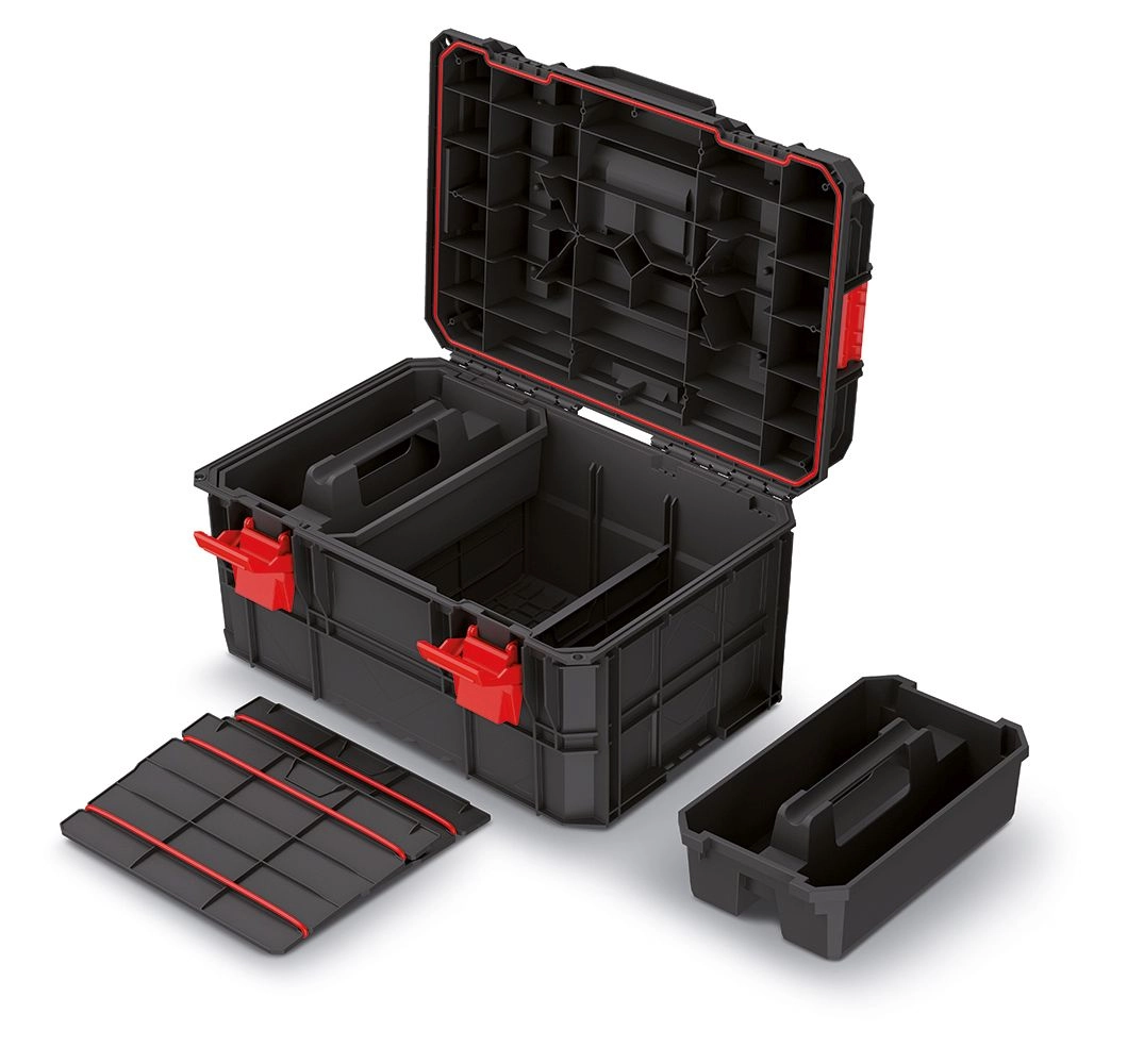 Profesionální modulární kufr na nářadí z řady X‑BLOCK pro náročné podmínky. Nabízí odolnou žebrovanou konstrukci, prachu a voděodolné těsnění, nosnost až 50 kg a možnost propojování do sestav. Výběrové modely umožňují díky hliníkovým lištám proměnit víko v stabilní pracovní stůl, moduly snesou přímé zatížení až 120 kg pro využití jako stupínek.