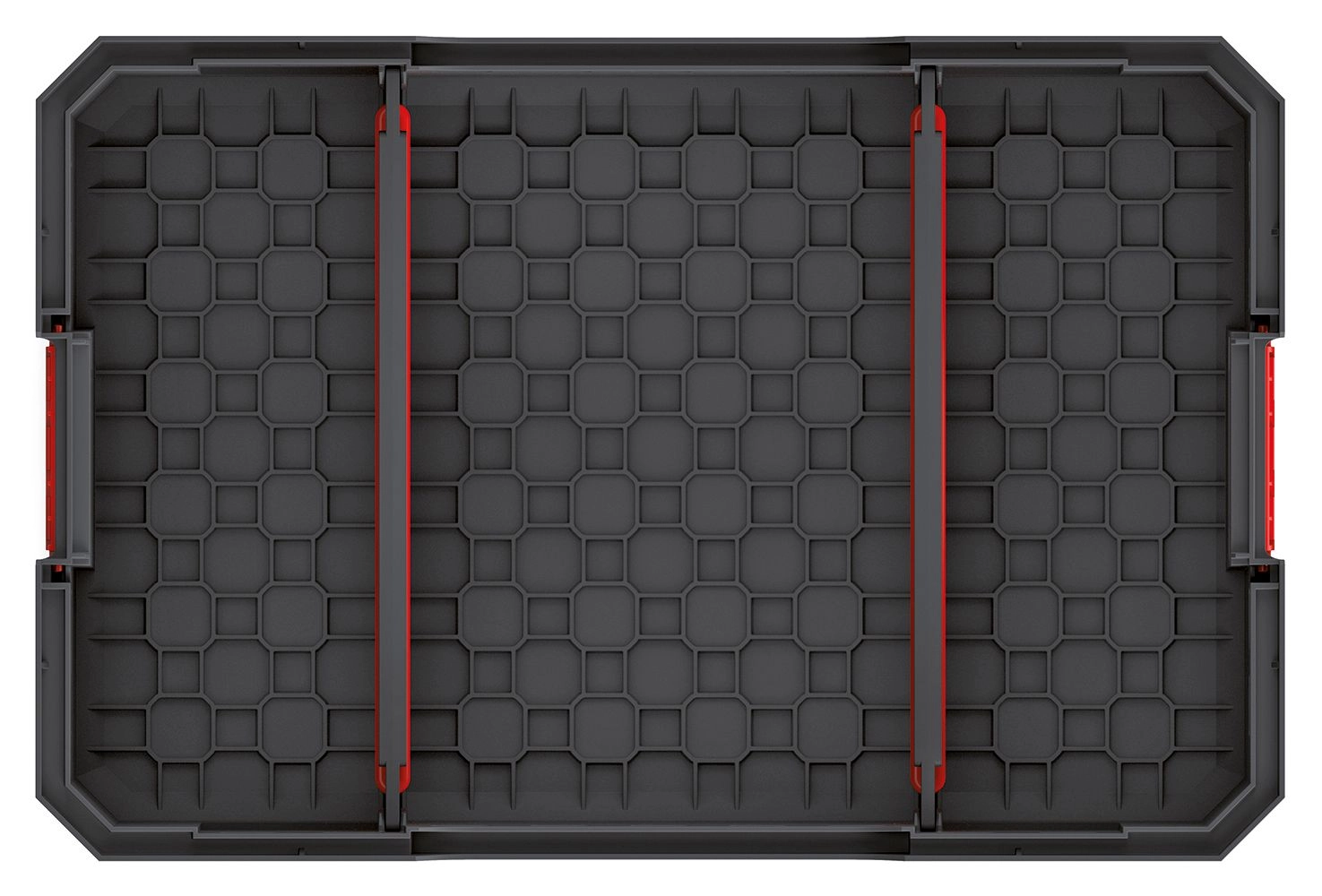Díky integrovanému těsnění je box chráněn proti prachu a vodě, zatímco žebrovaná konstrukce zajišťuje výbornou odolnost proti mechanickému poškození. Vybrané víkové moduly jsou vybaveny hliníkovými kolejnicemi, které umožní proměnit kufr v kompaktní a stabilní pracovní stůl – ideální pro řezání či montáž přímo na místě.