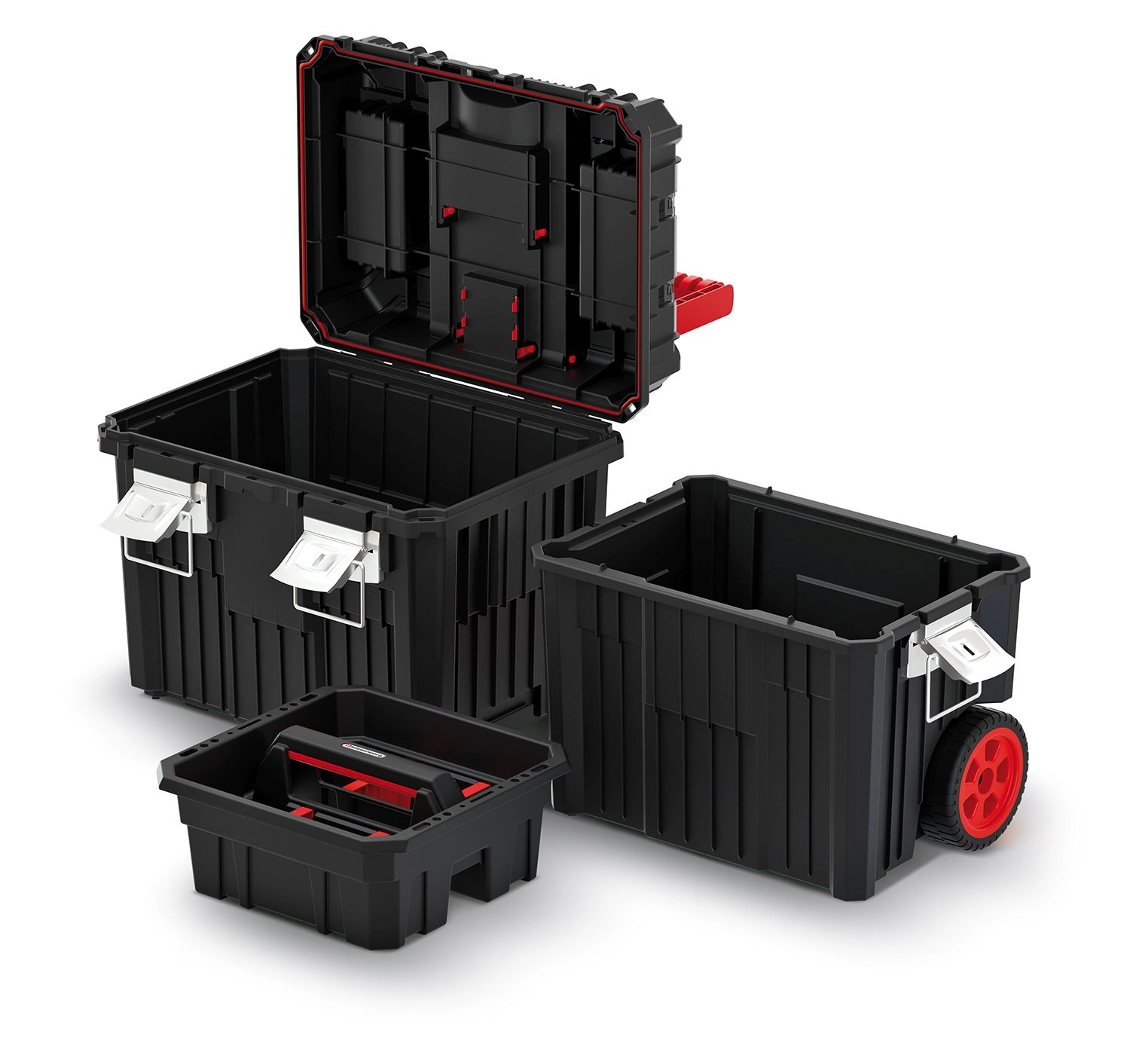 Uvnitř najdete vyjímatelný koš pro drobné nástroje a příslušenství a transparentní organizéry s polykarbonátovými víky pro rychlou orientaci bez nutnosti otevírání. Díky nosnosti až 25 kg a objemu 71 l pojme jak ruční nářadí, tak rozměrnější vybavení.