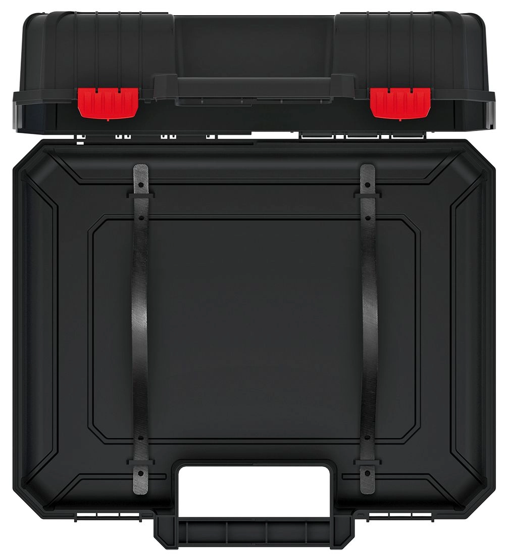 Kufr na nářadí Heavy je řešením pro profesionály i domácí kutily, kteří potřebují bezpečně převážet vrtačky, brusky, akumulátory, nabíječky a další příslušenství. Dvě robustní upínací pásky uvnitř spolehlivě zafixují vybavení, takže zůstane na svém místě během přenášení i převozu.
