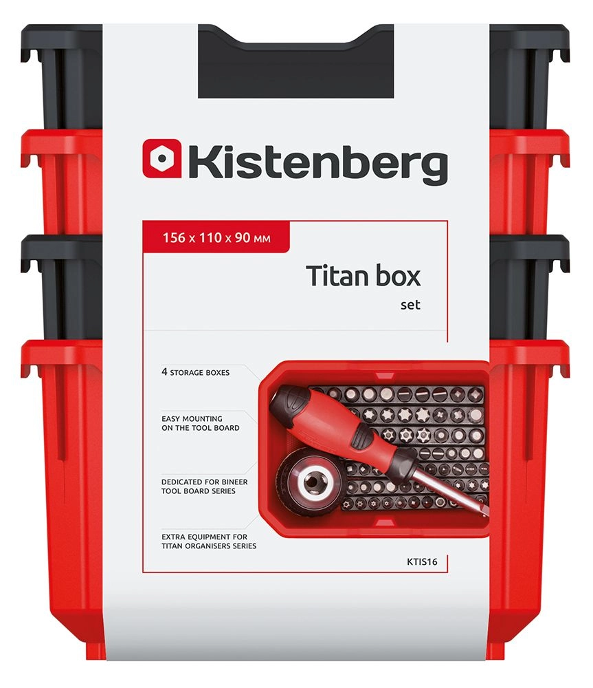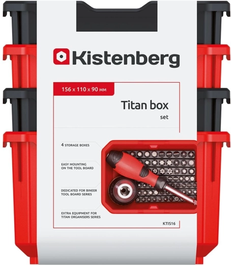 Pořiďte si chytré řešení pro přehledné uložení vrutů, hmoždinek, bitů či jiného drobného vybavení. Sada 4 ks boxů TITAN BOX v barvách černá/červená přináší vysokou odolnost, stabilitu a možnost stohování i zavěšení na perforované desky nebo dílenské panely. Rozměrná přední hrana usnadňuje manipulaci a odebírání obsahu.