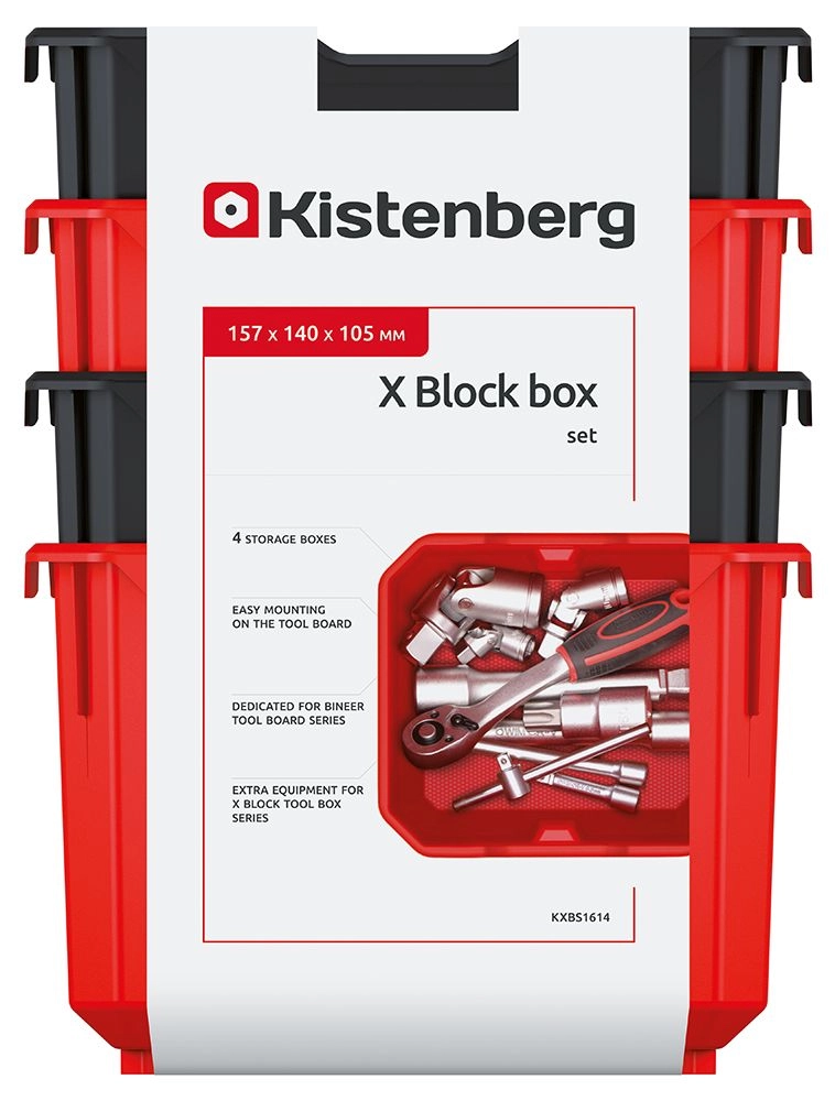 Sada čtyř modulárních boxů X Block Box nabízí chytré a odolné řešení pro třídění a skladování drobných dílů. Boxy mají otevřený vrch i čelo pro snadnou manipulaci, zesílené hrany a tvarovaný okraj pro bezpečné stohování na polici i v regálu.