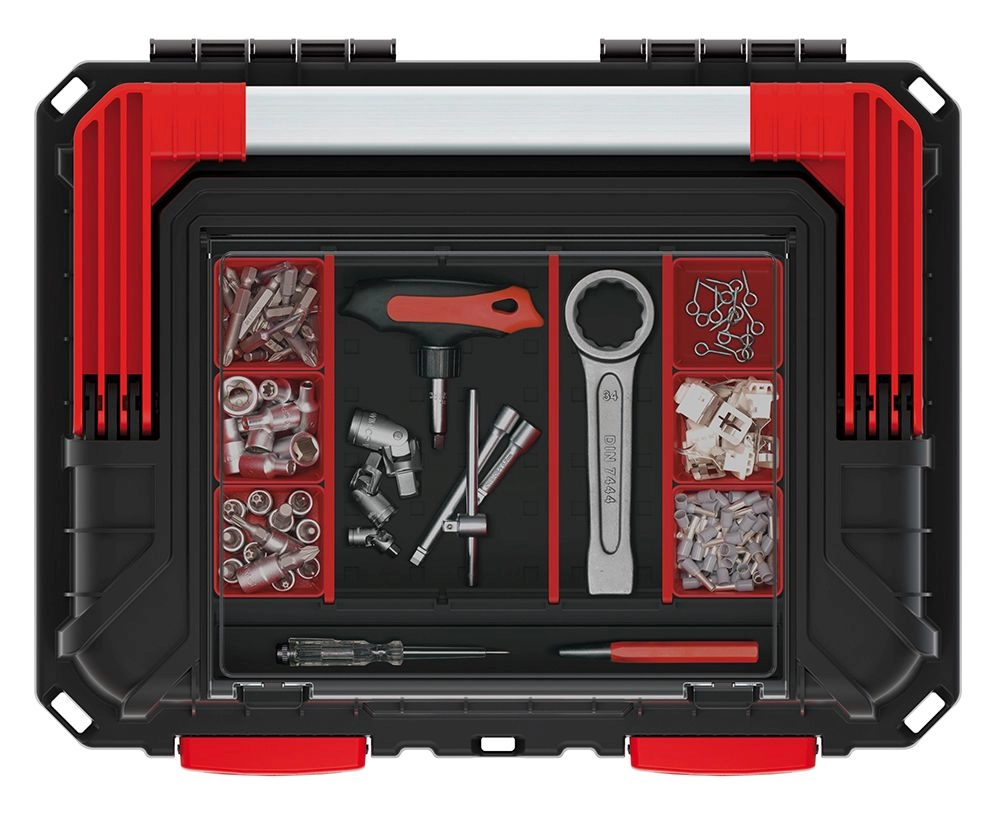 Vnitřní uspořádání s vyjímatelným vkladem pomáhá třídit šroubováky, kleště a drobný materiál. Vnější přihrádka pak poskytuje okamžitý přístup k nejčastěji používaným položkám, jako jsou bity, hmoždinky či metr. Praktické rozměry 445 × 360 × 337 mm nabízejí dostatek prostoru a přitom zachovávají dobrou přenosnost.