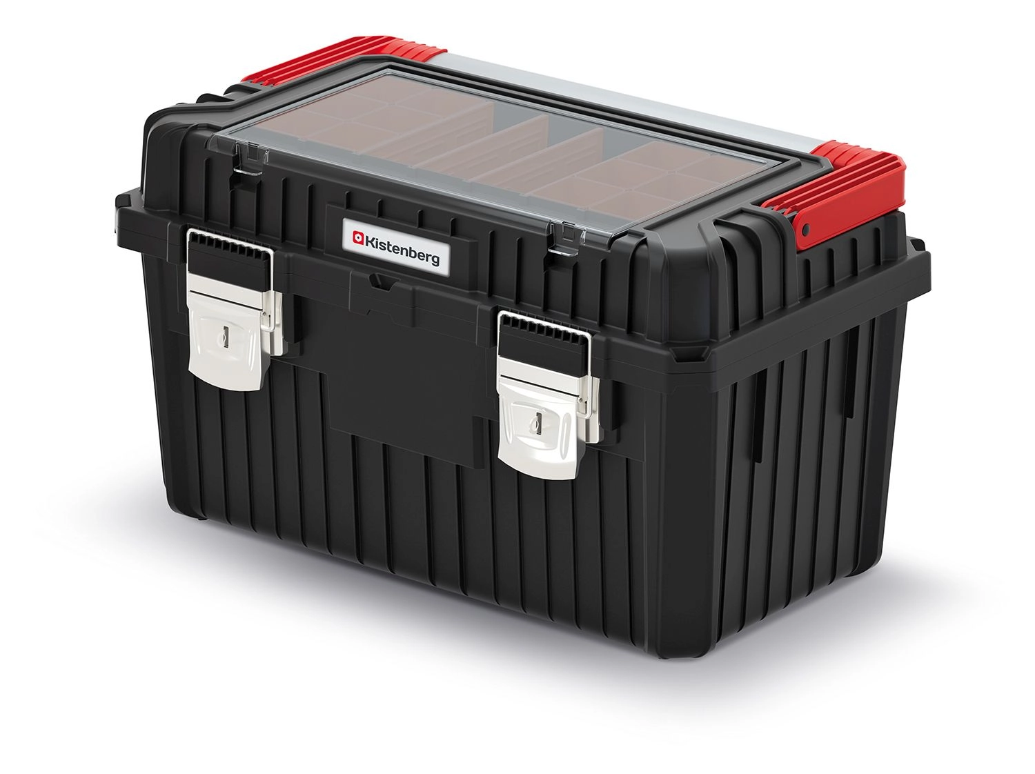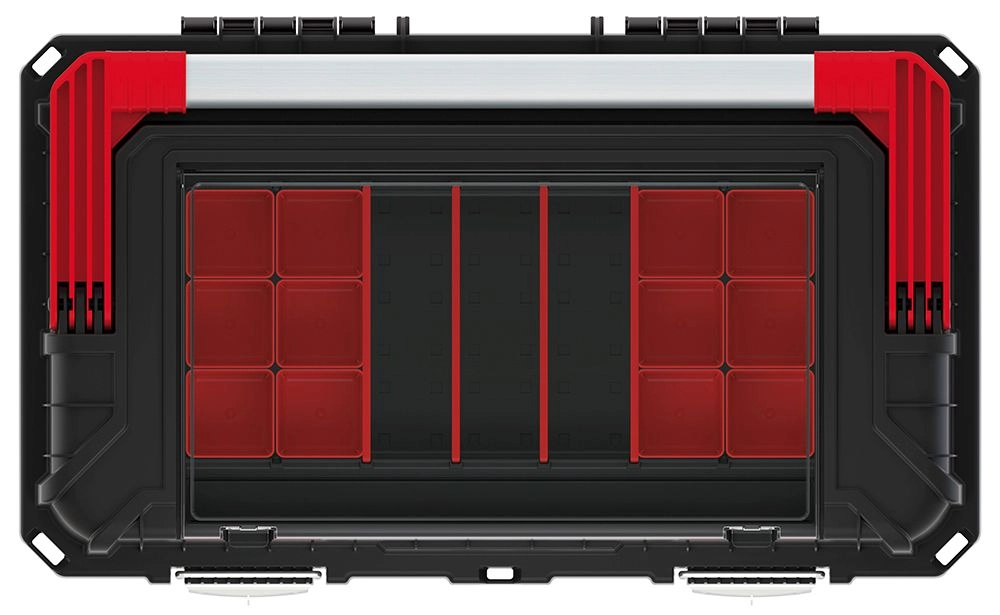 Díky promyšlenému vnitřnímu uspořádání, vyjímatelné vložce a vnější přihrádce si snadno roztřídíte nářadí i spotřební materiál. Pevné západky drží víko spolehlivě uzavřené, takže obsah zůstane v bezpečí i při přepravě.