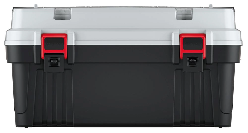 Silné přední přezky a zpevněné víko udrží nářadí v bezpečí i při častém převážení na stavbách a v dílně.