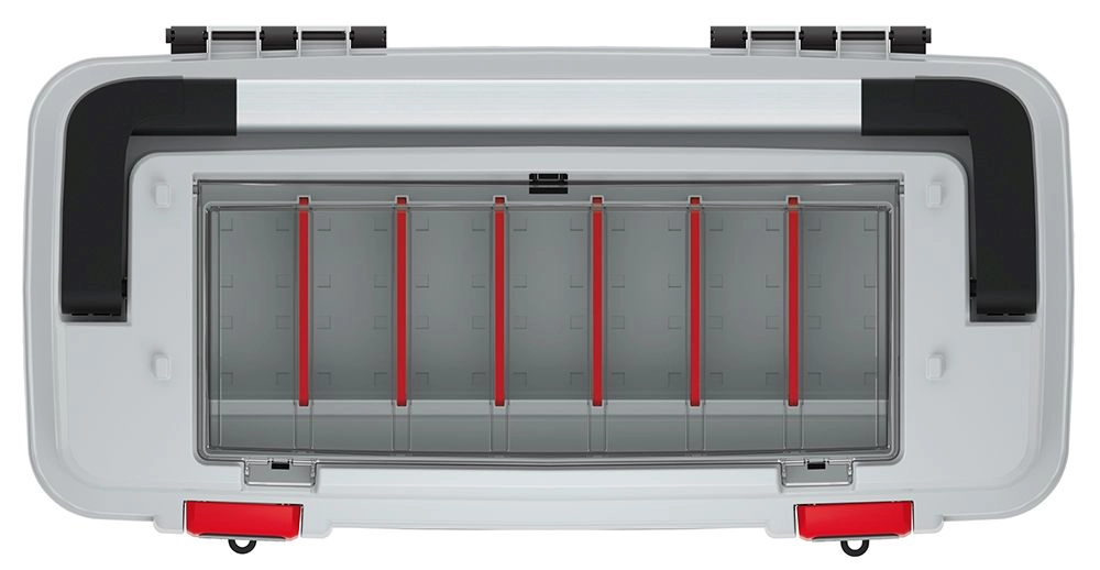 Transparentní víko a červené děliče poskytnou rychlý přehled o obsahu a bezpečně oddělí šroubky, bity a další drobnosti.