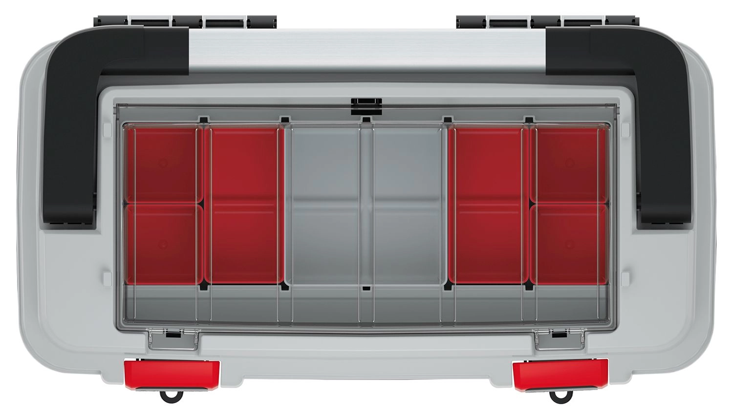 Vnitřní členění s vyjímatelnými zásobníky umožňuje snadno třídit a kombinovat přihrádky podle aktuálních potřeb projektu.