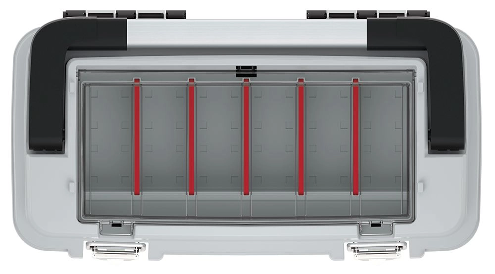 Transparentní horní organizér s nastavitelnými přepážkami udrží drobné součástky oddělené a rychle dostupné na první pohled.