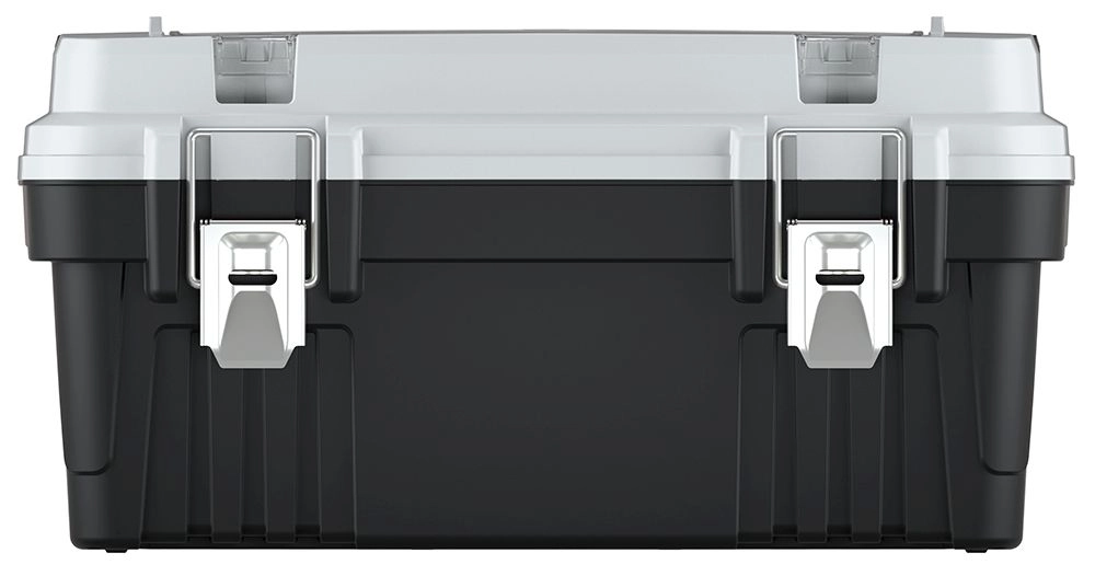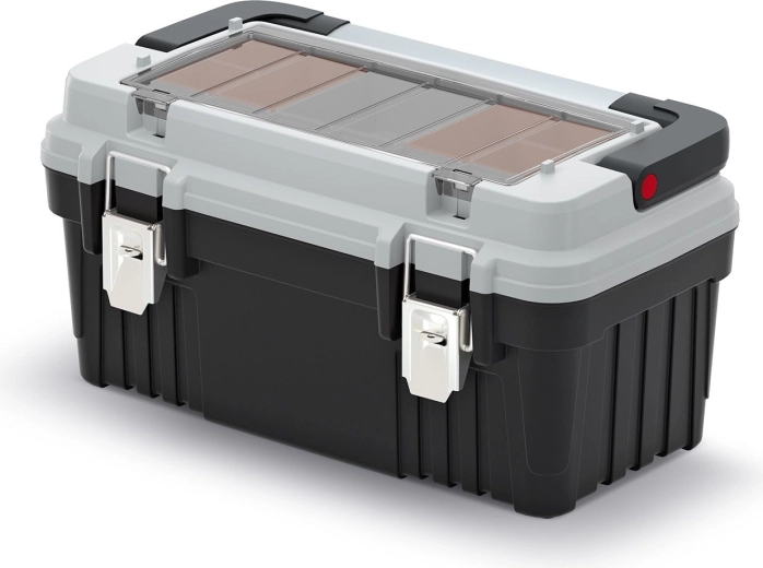 Kufr na nářadí OPTIMA v šedém provedení je navržen pro spolehlivé uložení a přenášení výbavy v dílně i v terénu. Robustní plastové tělo s kovovými prvky zajišťuje dlouhou životnost, zatímco praktická horní přihrádka s průhledným víkem a krabičkami udržuje spojovací materiál a drobné součástky perfektně uspořádané.