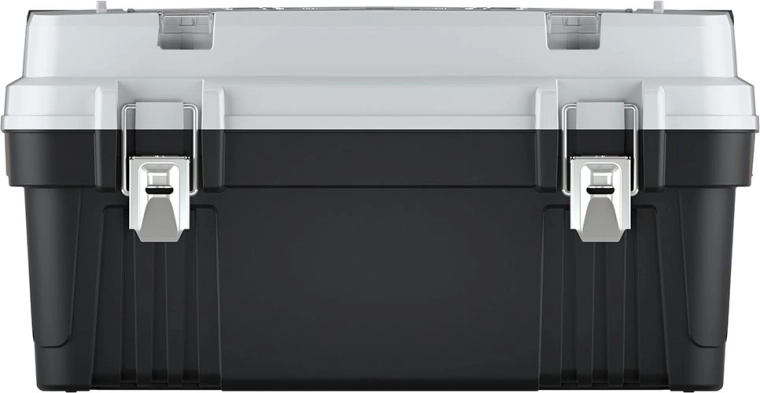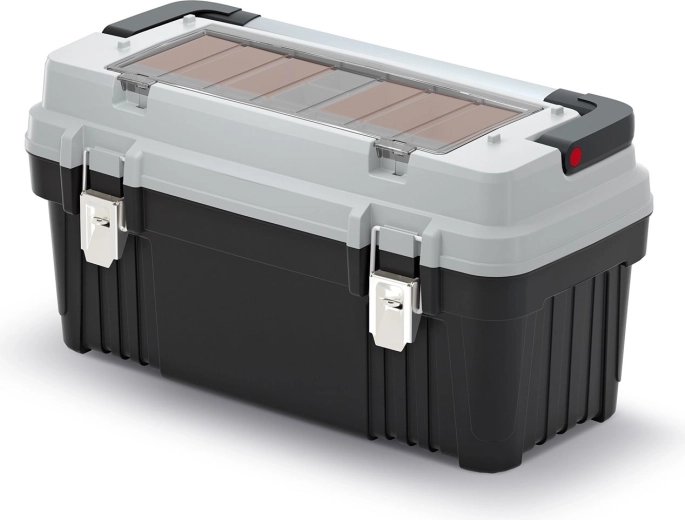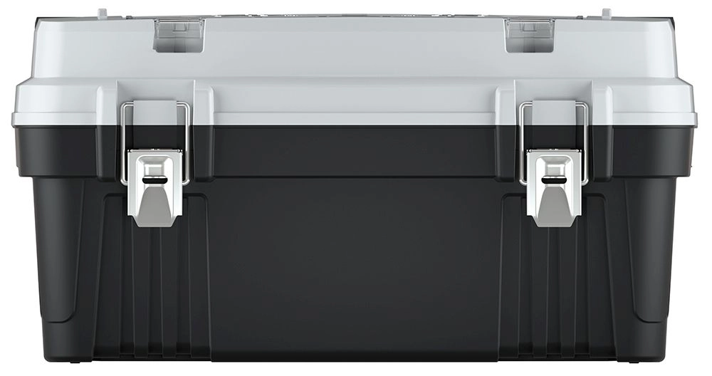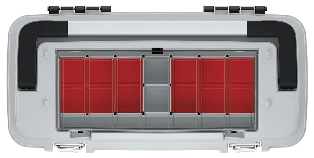 Vnější uzavíratelná přihrádka s krabičkami zrychlí práci – šroubky, hmoždinky a spojovací materiál máte ihned po ruce. Kovové zámky zajistí bezpečné zavření a kovové držadlo pohodlný a jistý úchop i při vyšším zatížení. Součástí je také vyjímatelný vklad pro flexibilní uspořádání.