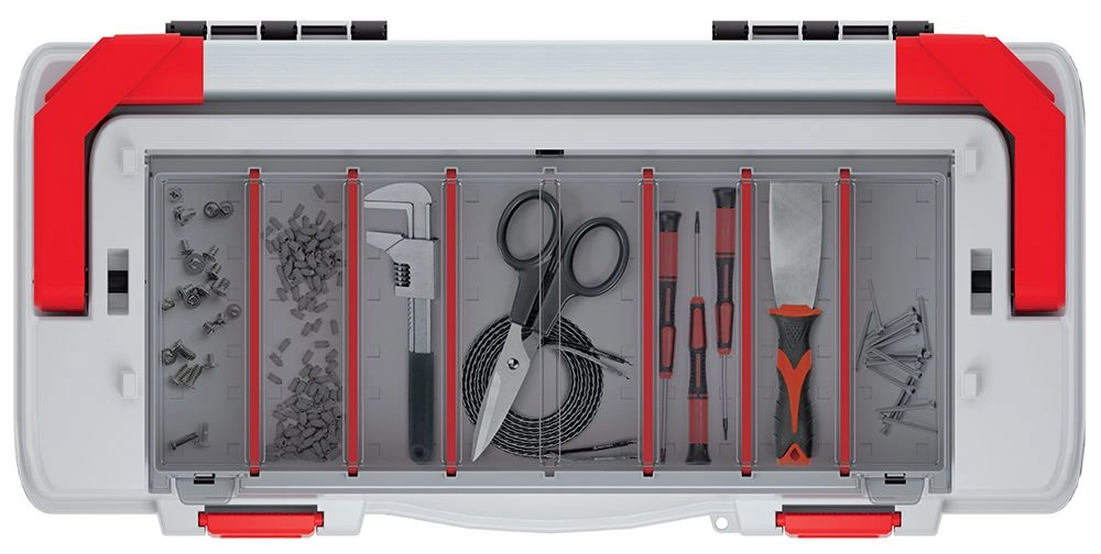 Horní transparentní organizér pojme drobný materiál a díky přepážkám si vnitřní prostor snadno přizpůsobíte aktuálním potřebám.