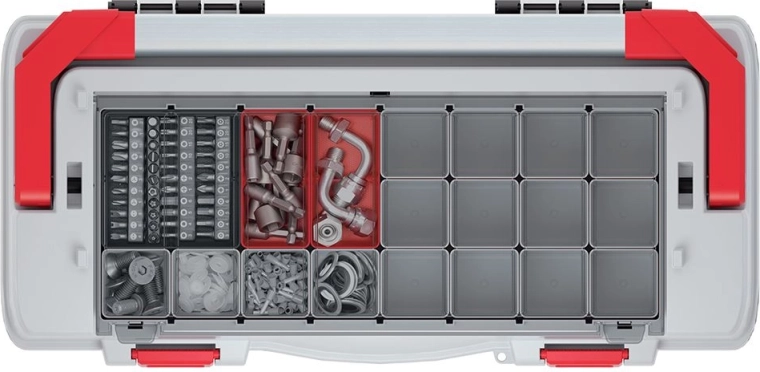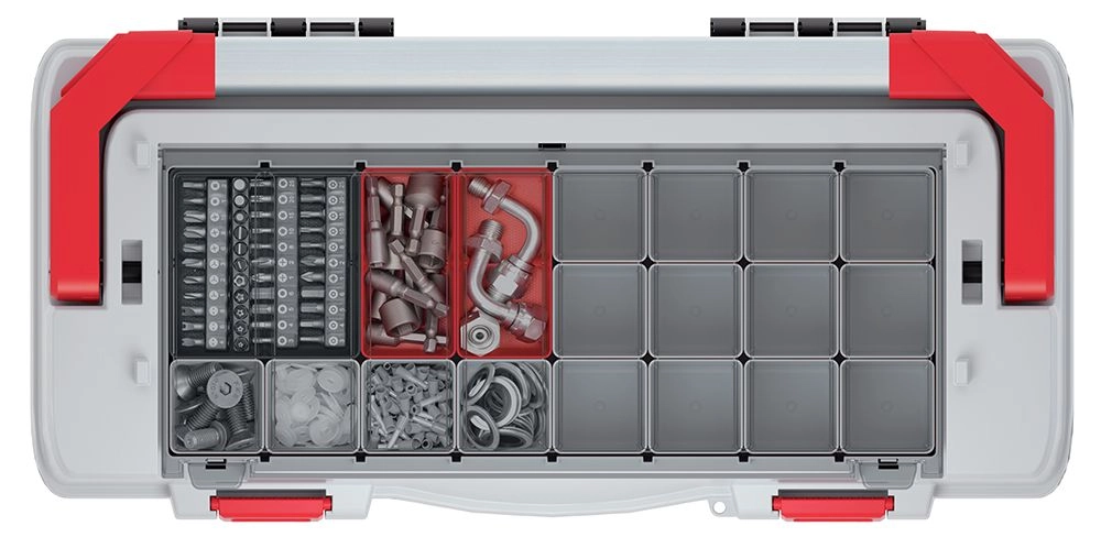 Transparentní víko s oddělenými přihrádkami udrží šroubky, bity a drobné součástky vždy po ruce a bez nepořádku.
