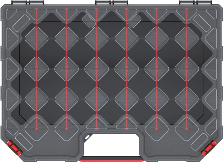Praktický plastový organizér s nastavitelnými přepážkami pro přehledné uložení drobných dílů. Má průhledné víko z odolného polypropylenu (PP), díky kterému máte obsah vždy pod kontrolou.