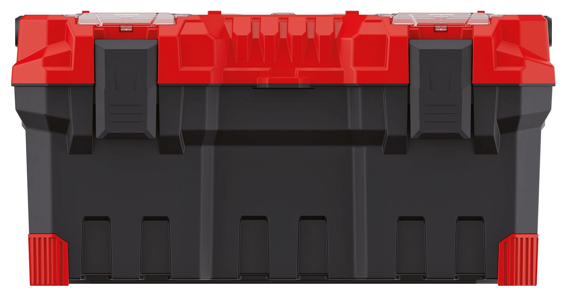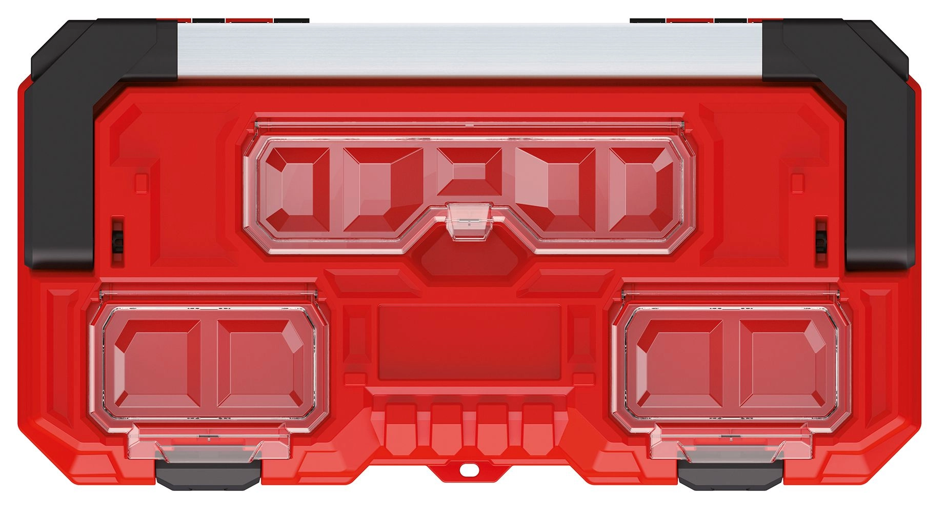 - Prostor a přehlednost: hlavní komora pro nářadí + horní transparentní přihrádky na drobnosti.